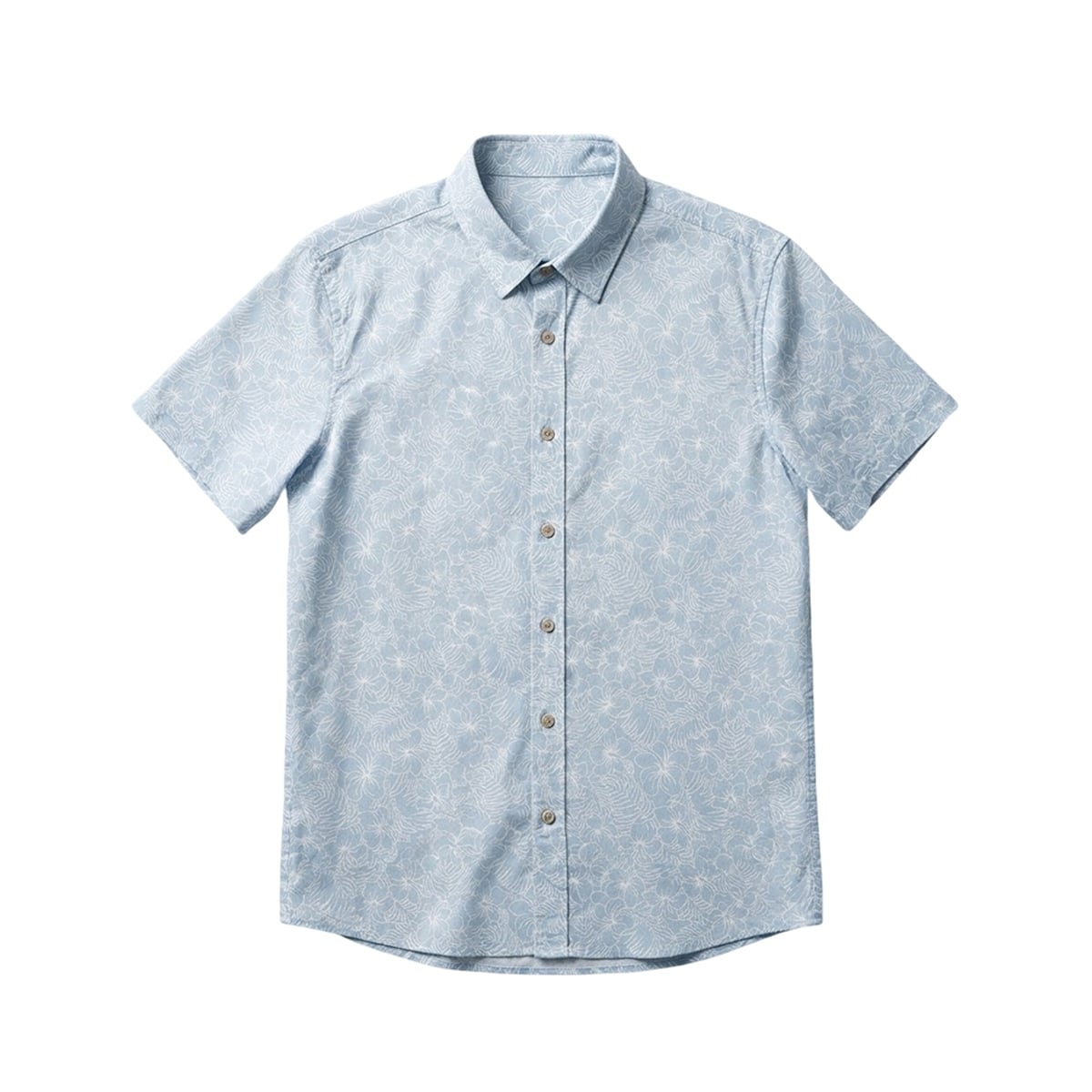 The shirt features a masterful visual composition that completely redefines traditional tropical wear. Moving away from loud, neon colors, this design utilizes a soothing, pale light blue base canvas. Across this backdrop, intricate white line-art illustrates a sprawling pattern of classic tropical flora, including delicate hibiscus flowers and sweeping palm fronds.