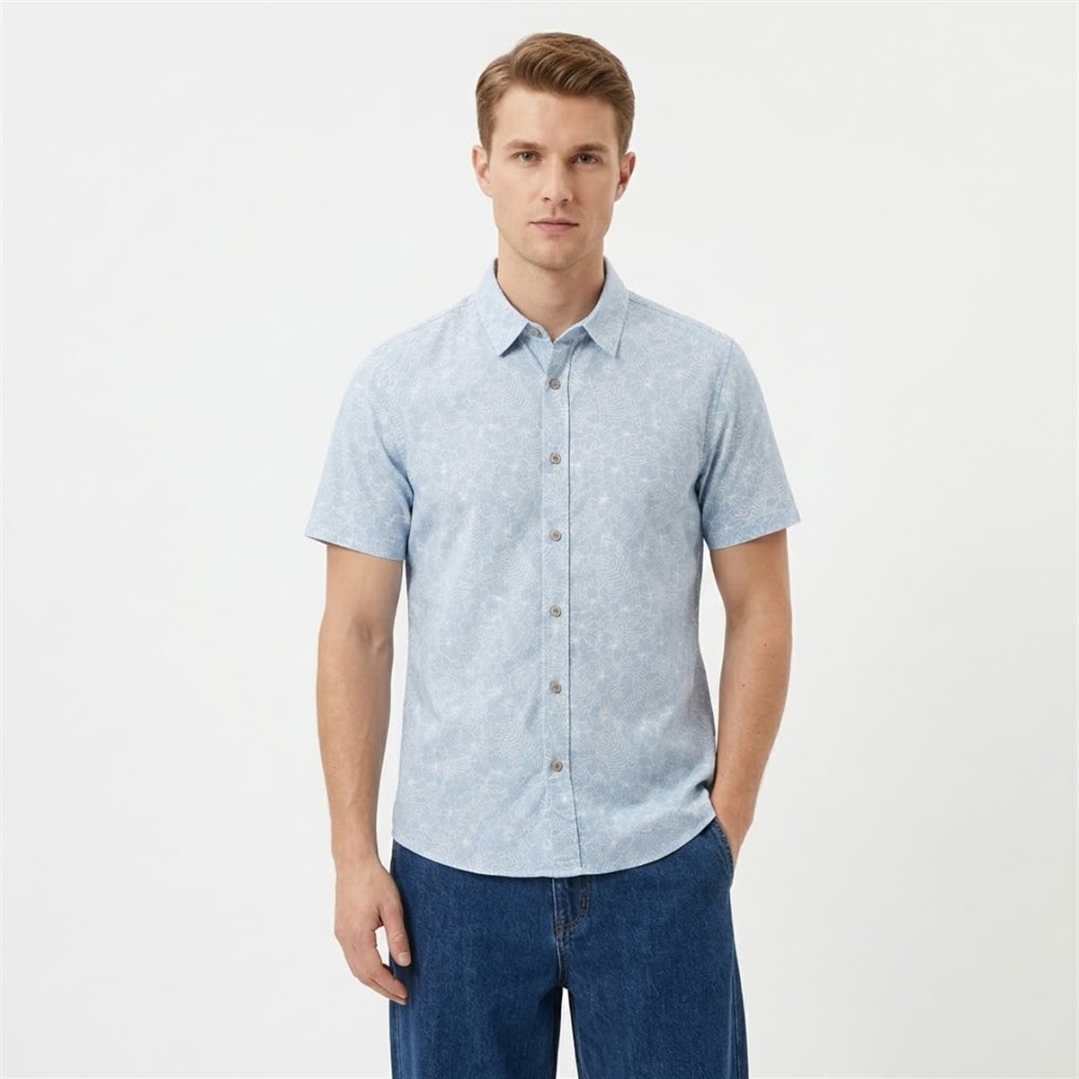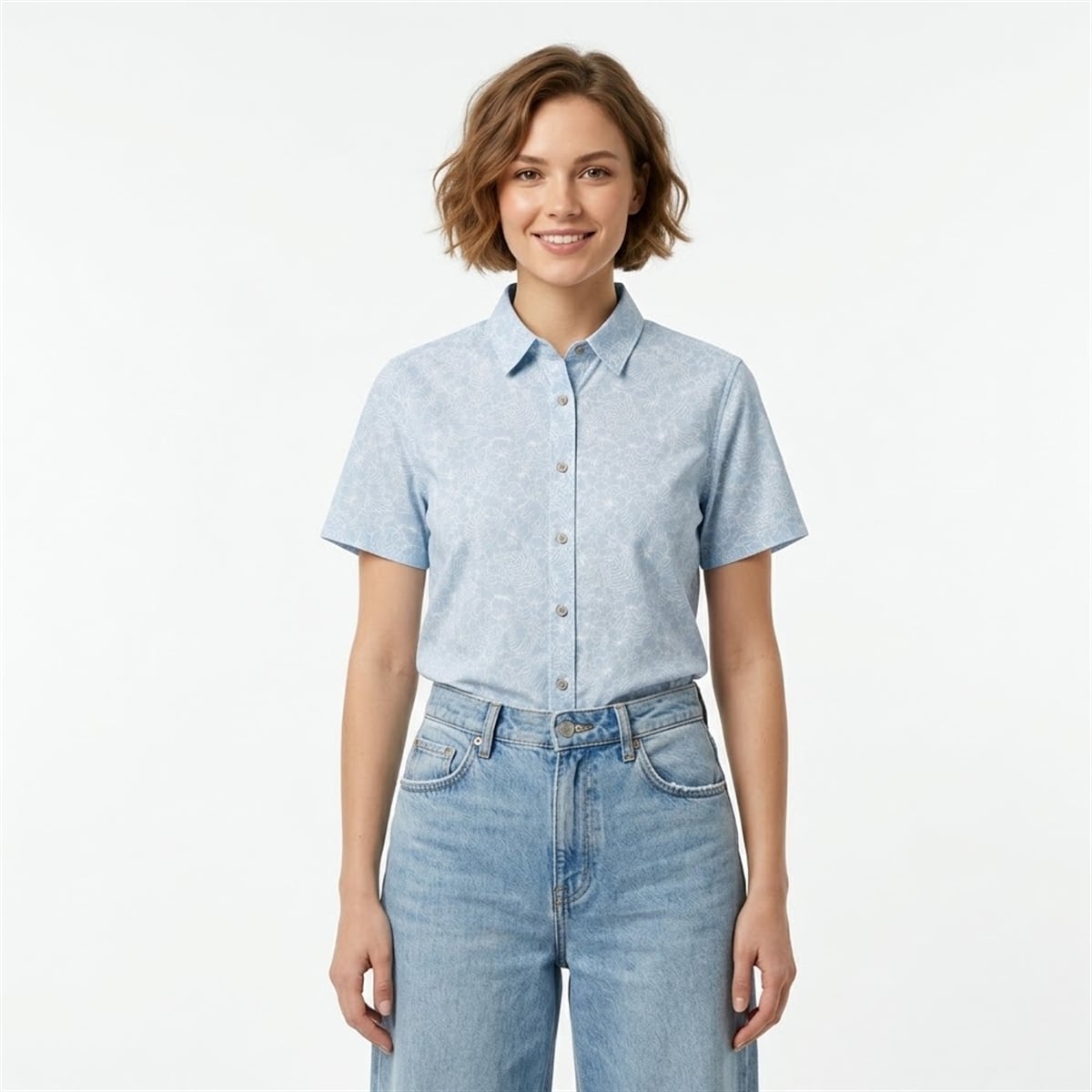 The silhouette boasts a classic short-sleeve cut, a structured collar, and a full button-down front featuring contrasting, earth-toned buttons. The visual harmony between the subtle white botanical outlines and the serene blue background creates a sophisticated, almost vintage coastal aesthetic. It is a visually soothing garment designed to look just as at home on a sun-drenched boat deck as it does under the bright studio lights of a national singing competition.