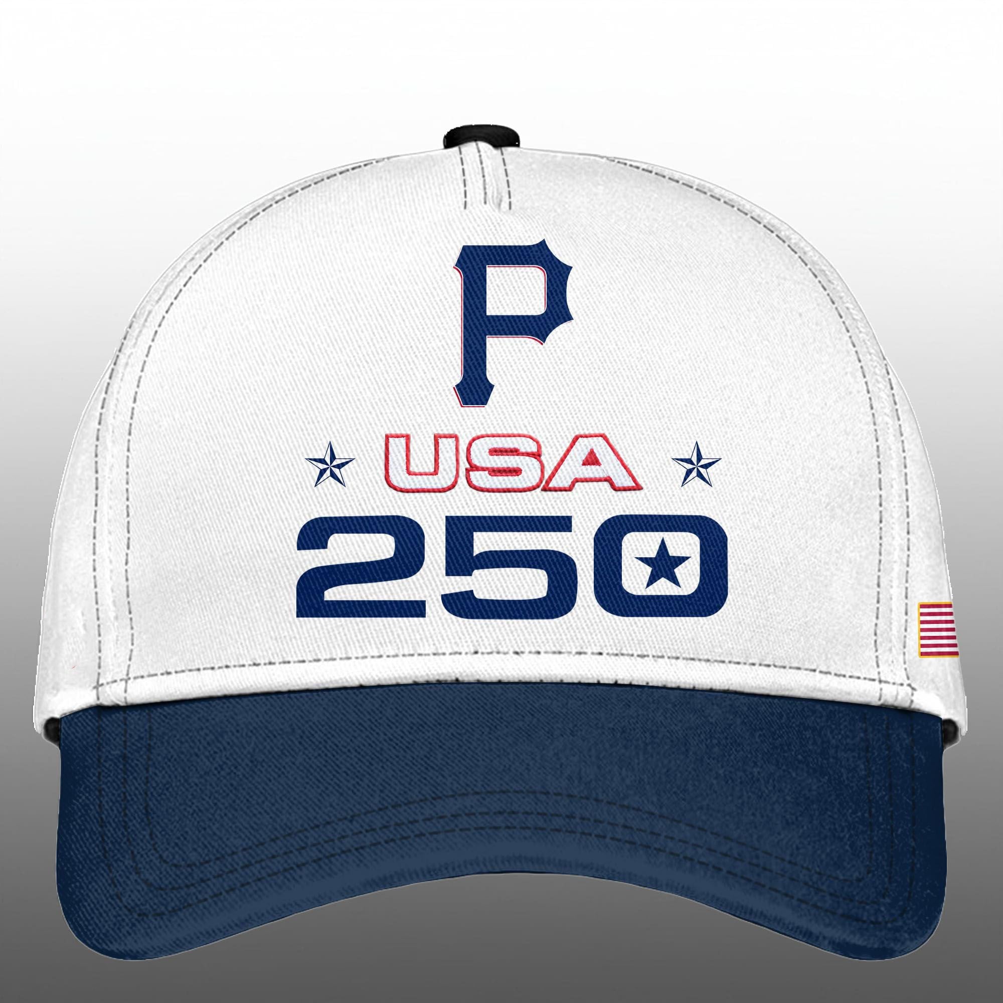 The Hat Design: Complementing the jersey, the cap features a two-tone construction with a white crown and a navy blue brim. The front panel proudly displays the Pirates’ “P” logo above a structured “USA” and “250” graphic, mirroring the jersey’s back design. The side profile includes the American flag, tying the entire look together. This cohesive design language ensures that the wearer presents a unified, celebratory aesthetic suitable for the historic year.