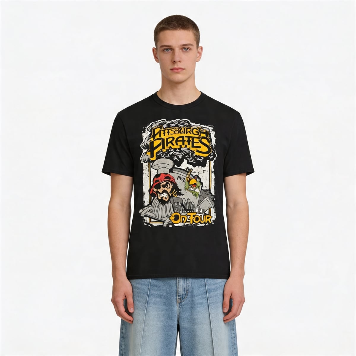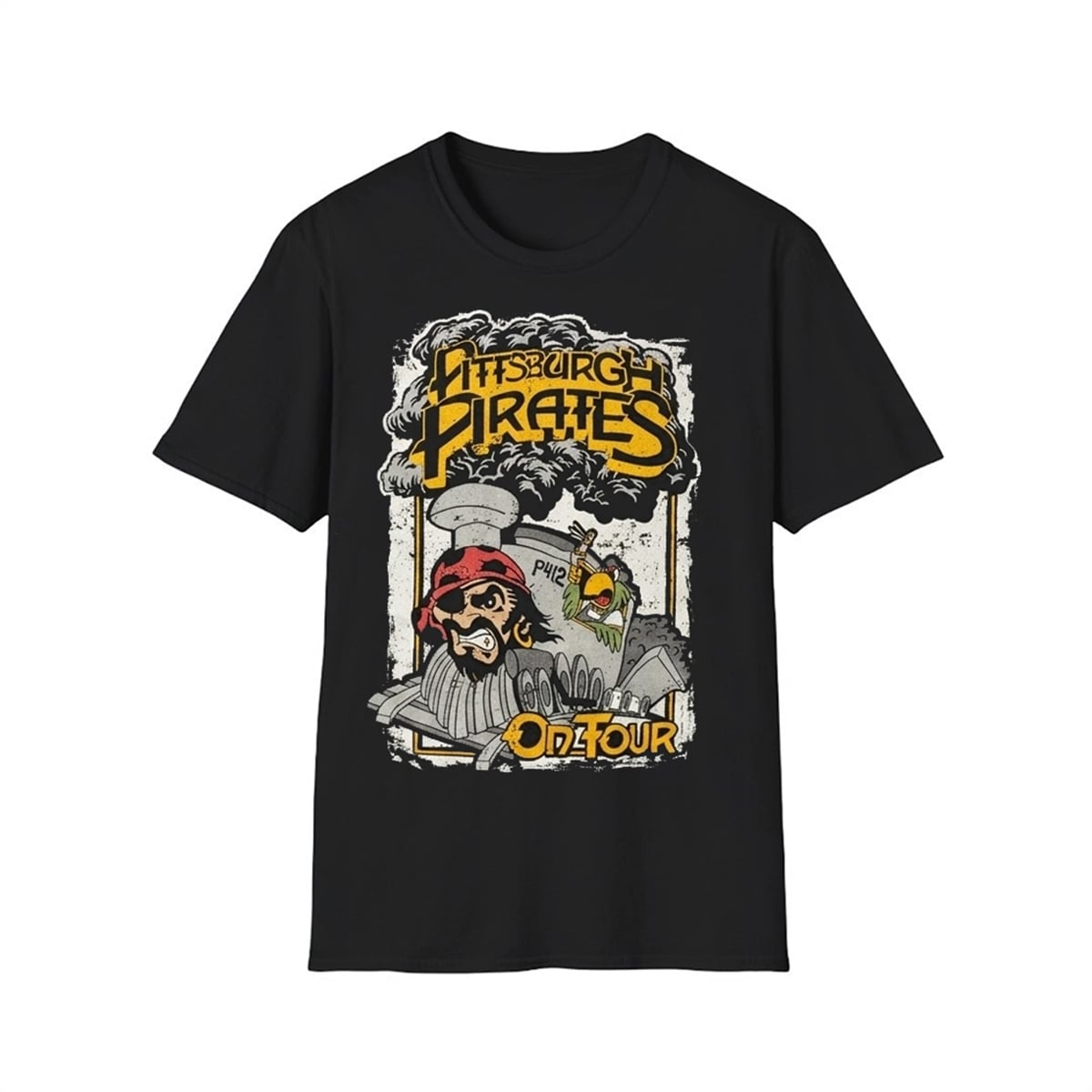 The shirt represents a bold departure from conventional sports merchandise. Set against a stark black background, the front graphic utilizes a heavily distressed, retro-rock aesthetic reminiscent of vintage heavy metal and classic rock concert posters. At the top, the words “Pittsburgh Pirates” are emblazoned in a jagged, electrifying yellow font, framed by billowing grey smoke. The centerpiece of the design is a fiercely illustrated locomotive barreling forward, piloted by a rugged, eye-patch-wearing Pirate and accompanied by the iconic Pirate Parrot hanging off the side of the train cab. The bottom of the graphic proudly declares “On Tour” in matching distressed yellow lettering, completing the illusion of a rock band’s cross-country tour merchandise.