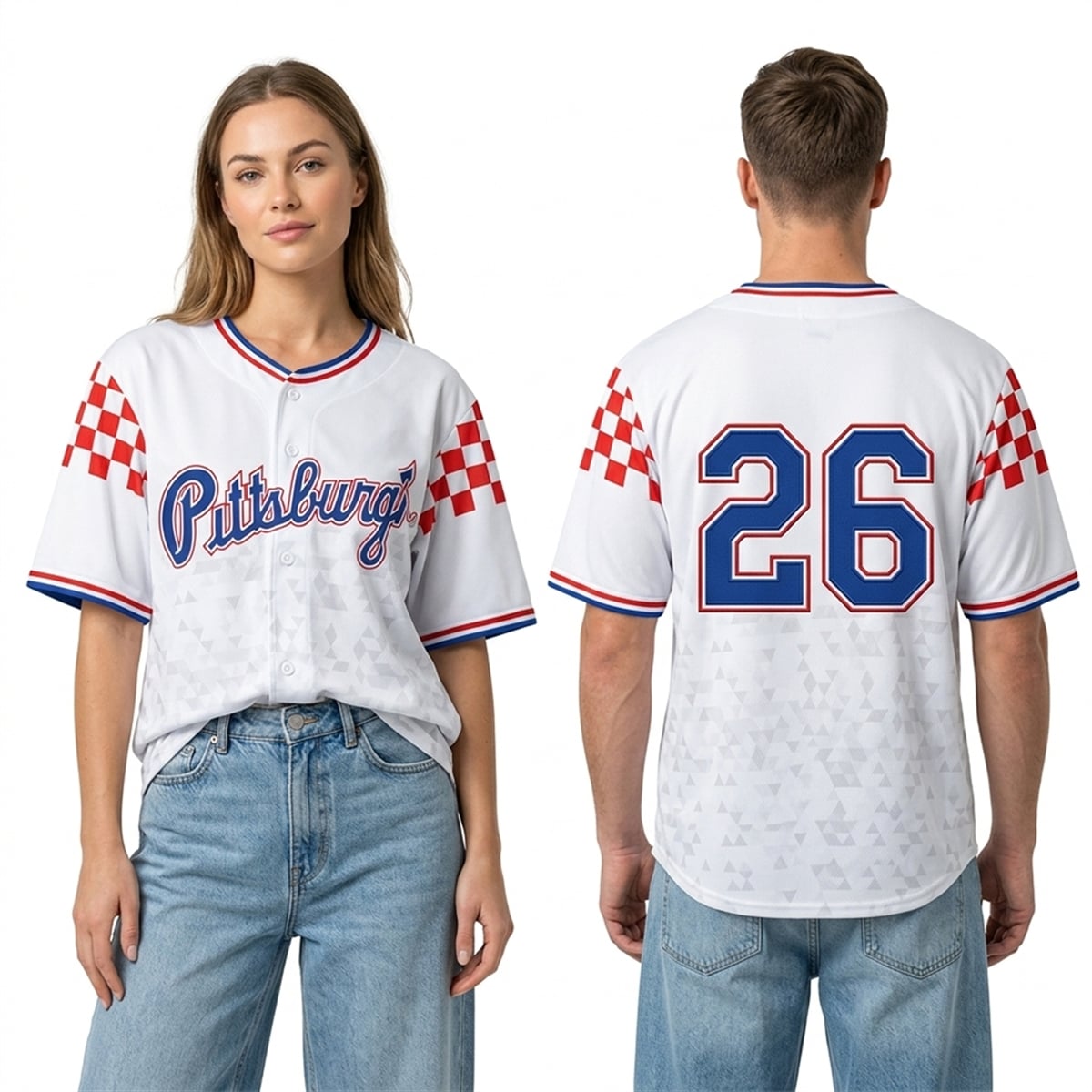 The jersey is a visual masterpiece designed to celebrate the deep-rooted Croatian community within the greater Pittsburgh area. The design features a pristine white base adorned with subtle, repeating geometric triangle patterns that add depth and modern flair to the visual profile. Across the chest, the classic “Pittsburgh” script is prominently displayed in a bold blue font with striking red outlines. The back of the jersey showcases a large, matching “26” to commemorate the 2026 baseball season. The defining characteristic of this piece, however, is the sleeves, which feature the iconic red and white checkerboard pattern, making it an instant standout in any sports wardrobe.