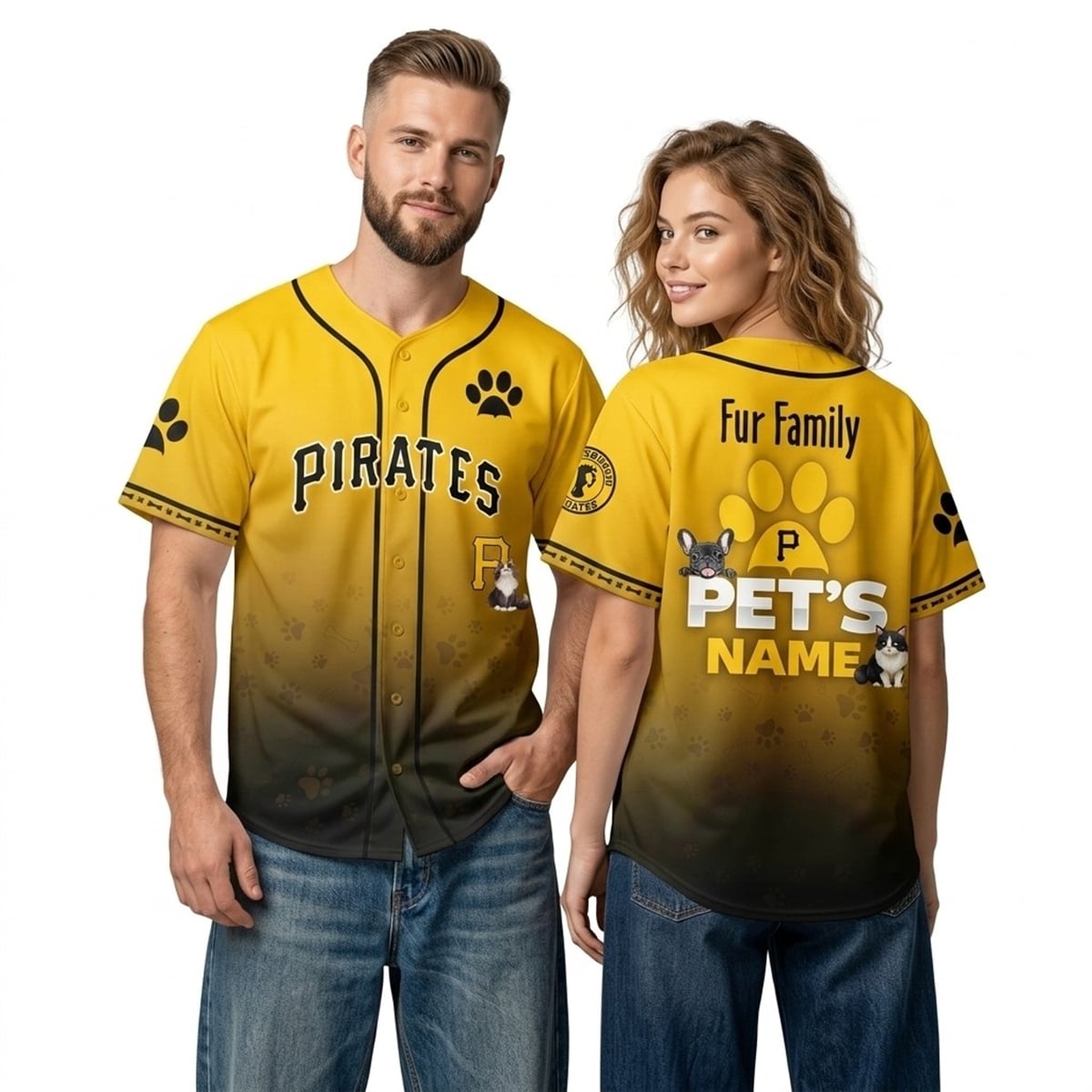 The jersey is a highly customizable piece of fan apparel designed specifically for pet-loving sports enthusiasts. Visually, the jersey features a striking yellow-to-black gradient design that instantly evokes the iconic spirit of Pittsburgh baseball. The front proudly displays the classic “PIRATES” lettering, accompanied by playful paw prints and charming pet illustrations. The back of the jersey is where the true magic happens: beneath the prominent “Fur Family” heading and a large yellow paw print, there is a dedicated space to prominently display your own “PET’S NAME” alongside adorable, stylized graphics of a dog and a cat.