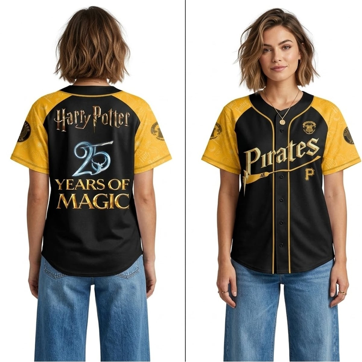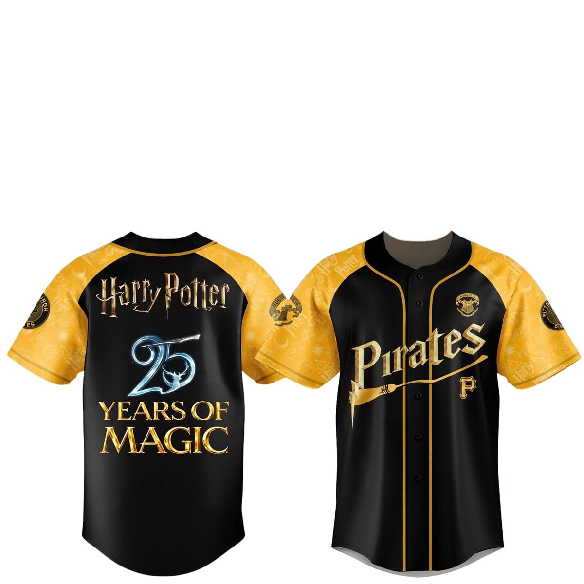 The jersey is a masterclass in collaborative visual design. The core of the aesthetic relies on the traditional Pittsburgh Pirates color palette—deep black contrasted with striking gold—which naturally lends itself to the magical theme, reminiscent of certain famous Hogwarts houses. The front of the jersey features the classic “Pirates” script, brilliantly reimagined with a broomstick sweeping through the lettering. The sleeves are a vibrant gold canvas, densely populated with iconic, subtle magical symbols such as lightning bolts, flying keys, and starry motifs. On the back, the bold “25” is entwined with a brilliant, ethereal Patronus graphic, anchoring the tribute to the “Years of Magic.”