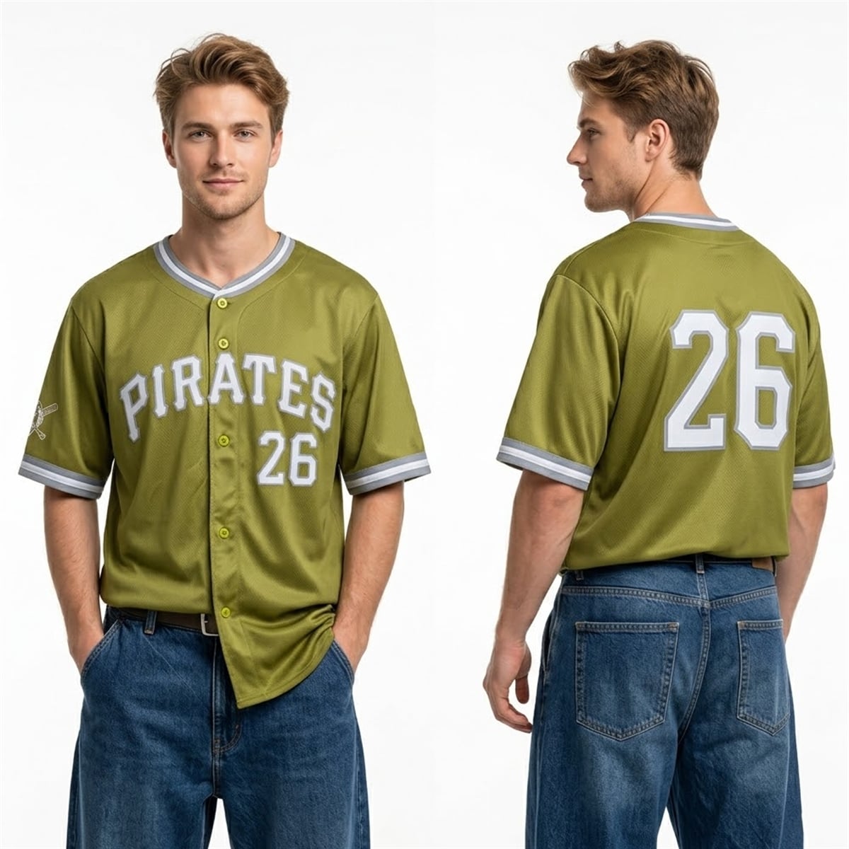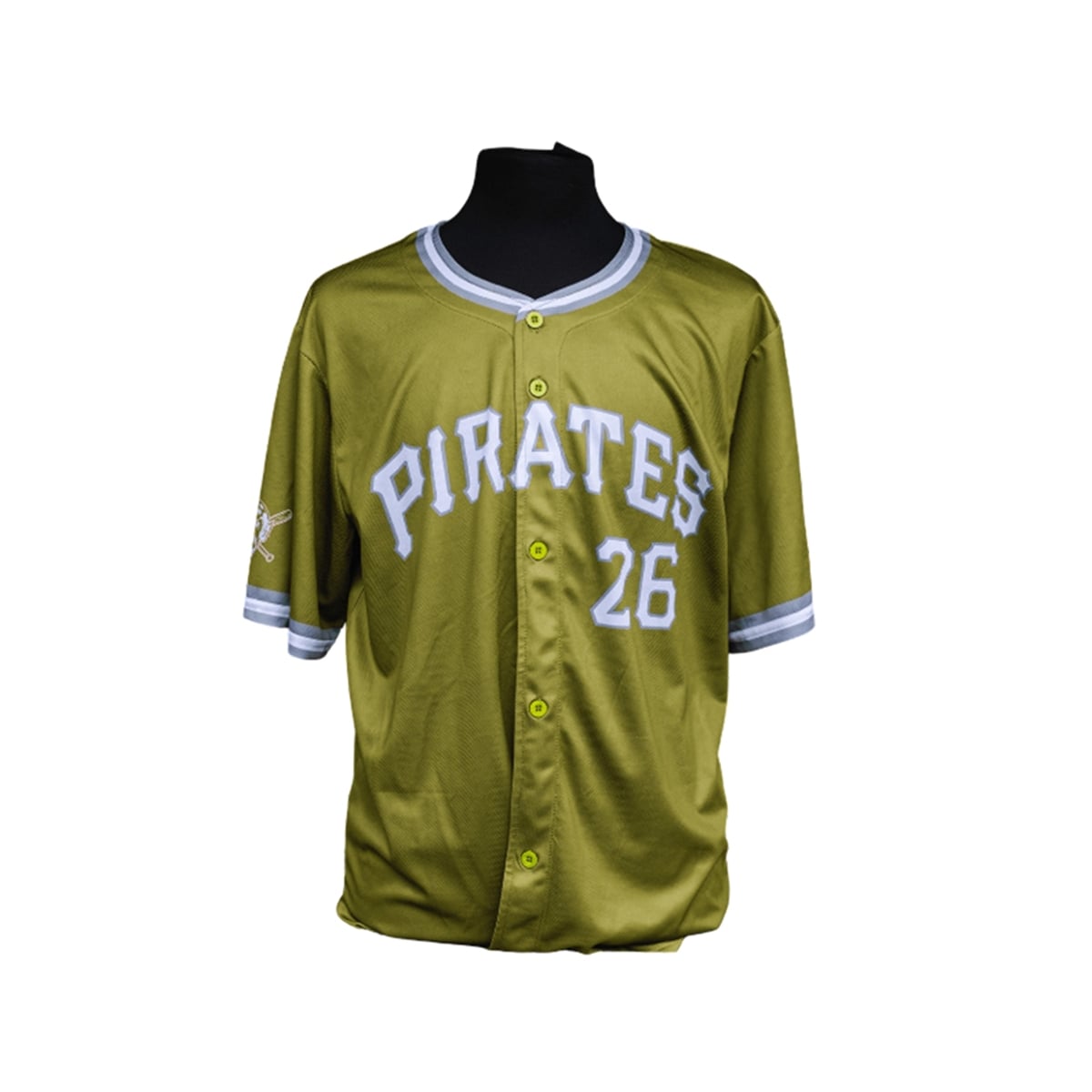 The jersey is a triumph of collaborative sports design, breaking away from standard team palettes to introduce a breathtaking olive-green base. Prominently displaying the iconic “PIRATES” wordmark arched beautifully across the chest in stark white with grey outline accents, the design commands immediate attention. The front and back both feature the number “26,” celebrating the specific season of this highly anticipated promotional event. Complementary grey and white striping along the collar and sleeve cuffs frames the garment perfectly, while a custom crossover logo patch on the right sleeve completes the look. This piece bridges the gap between classic baseball heritage and modern campus aesthetics.