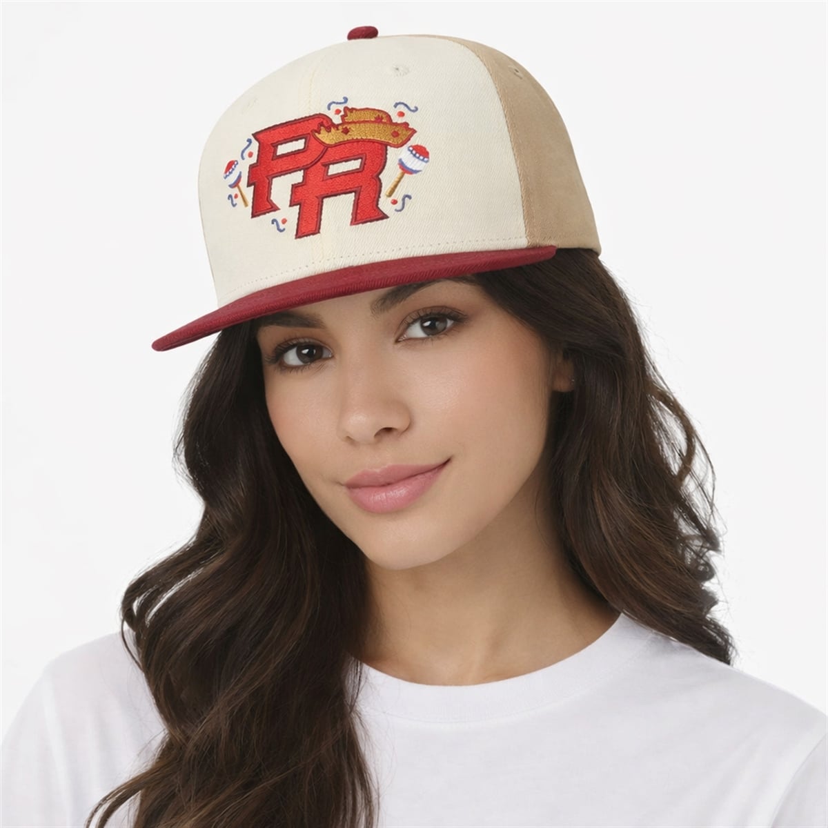 The hat is a masterful blend of sports fandom and cultural storytelling. Visually, the hat features a striking two-tone aesthetic with a warm tan crown, a cream front panel, and a deep maroon visor. The centerpiece is the bold, red “PR” logo playfully interacting with musical notes and confetti. Adorning the letter “P” is a traditional Puerto Rican pava hat, while maracas flank the sides of the initials. Moving to the side profile, an intricate illustration of a traditional drum anchors the musical theme. The rear of the cap proudly displays the World Baseball Classic logo, authenticating its status as 2026 tournament gear.