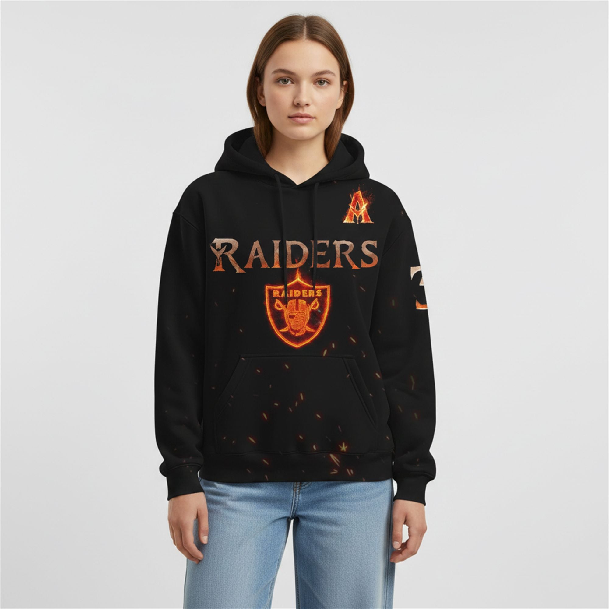 The front of the hoodie abandons the traditional flat colors for a dynamic, ember-glow finish. The “RAIDERS” text appears forged from molten iron, sitting above a shield that looks as if it’s burning from within. On the back, the massive, fiery “A” logo anchors the design, symbolizing the unstoppable force of nature—a perfect metaphor for the Raider Nation’s notorious intensity. The “Fire and Ash” theme is more than just a movie tie-in; it represents the team’s ability to withstand the heat and emerge stronger. It is the perfect gear for the 2026 “Revenge Tour.”