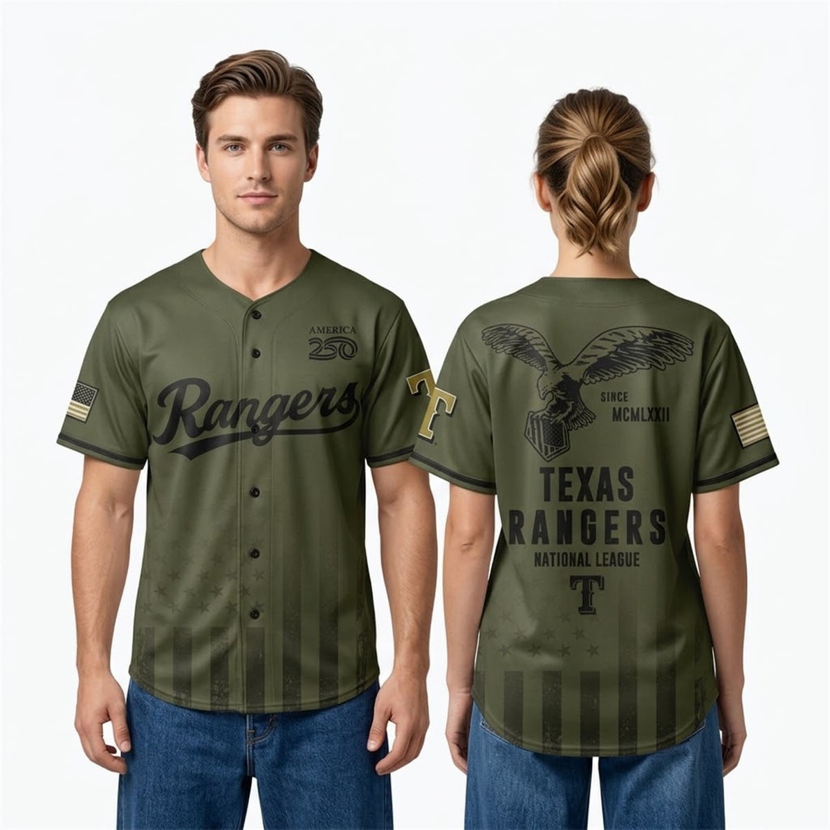 The jersey is a bold, aesthetically commanding piece of sports memorabilia. Draped in a deep olive green hue reminiscent of classic military styling, the front displays the iconic “Rangers” script in stark, contrasting dark tones. Accompanying the team name is the “America 250” logo, visually marking the United States Semiquincentennial. The design features a subtle, distressed stars-and-stripes pattern fading upward from the bottom hemline. On the reverse side, the jersey commands attention with a large, intricately detailed illustration of a bald eagle clutching a shield, positioned above the bold text “TEXAS RANGERS NATIONAL LEAGUE” and the team’s iconic “T” logo. A subdued American flag patch graces the right sleeve, completing the patriotic visual narrative.