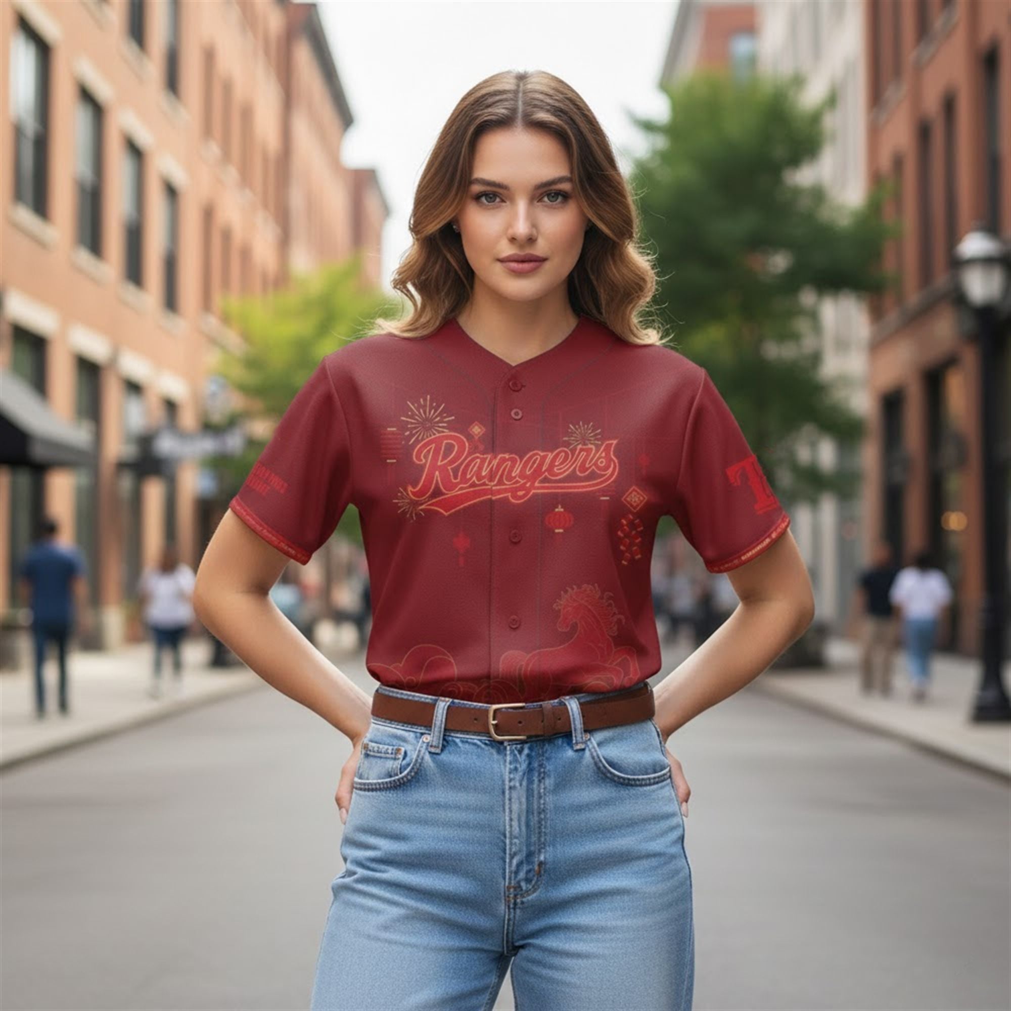 The jersey is a visual masterpiece that seamlessly integrates baseball culture with traditional Lunar New Year iconography. The base of the jersey features a stunning, deep maroon-red hue, a color universally recognized in many Asian cultures as a symbol of luck, joy, and prosperity. Across the chest, the iconic “Rangers” script is beautifully illuminated in gold, surrounded by festive fireworks and hanging traditional lanterns that evoke the spirit of community celebrations.