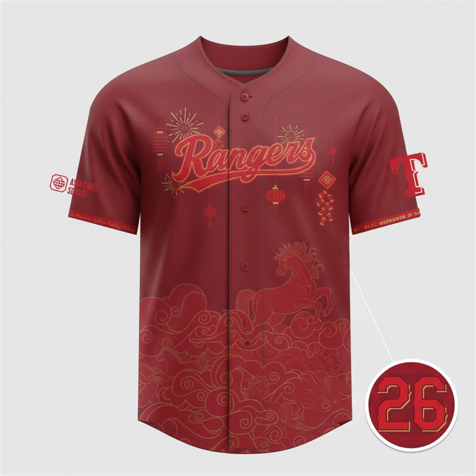 The lower half of the jersey is where the design truly comes alive, showcasing a majestic golden horse galloping through elegantly stylized, swirling clouds, perfectly commemorating the 2026 Year of the Horse. Additional details include the prominent “Asia Times Square” sponsorship insignia on the right sleeve, acknowledging the local cultural hub, and the classic Texas “T” logo on the left sleeve. A bold “26” is featured to forever mark the specific year of this historic team event.