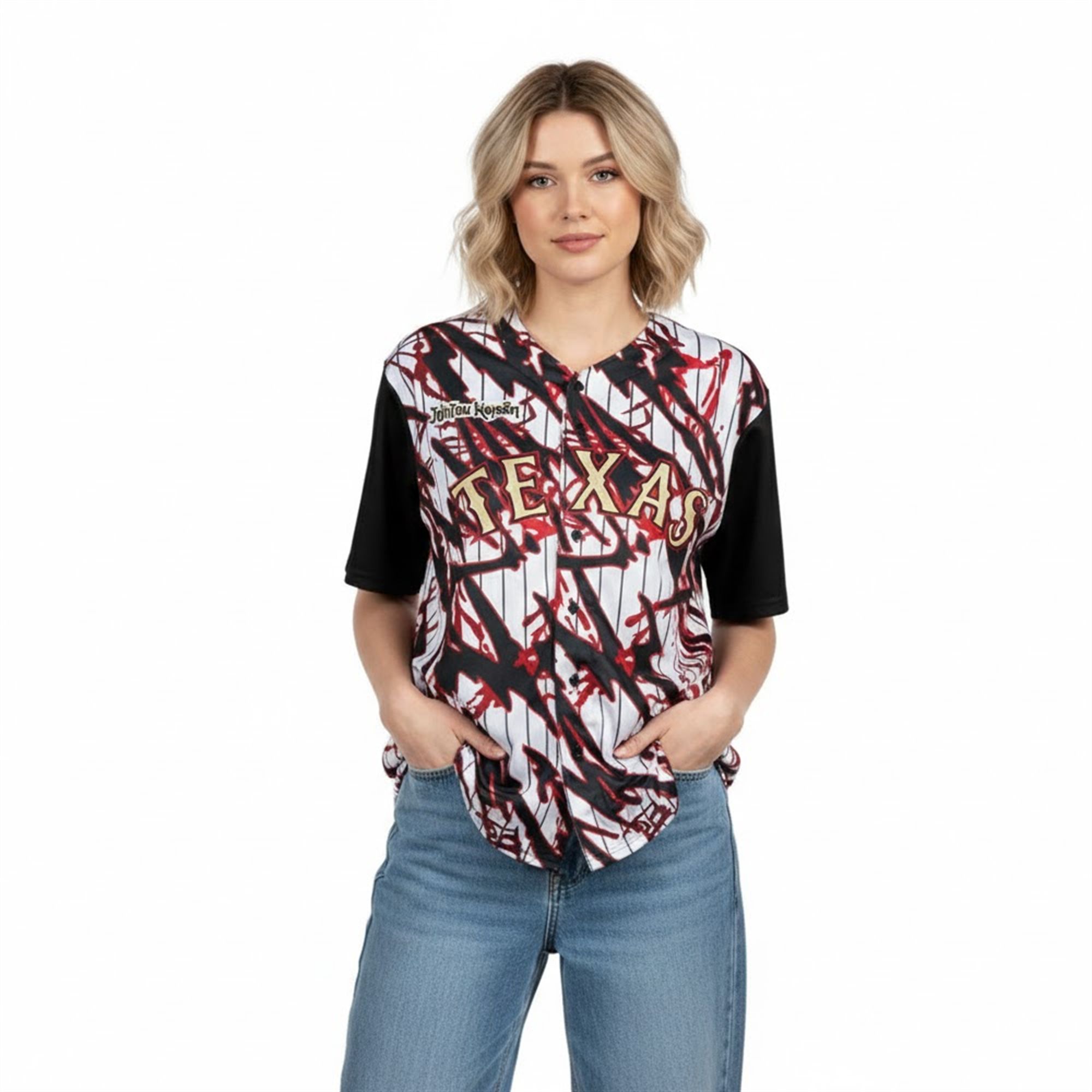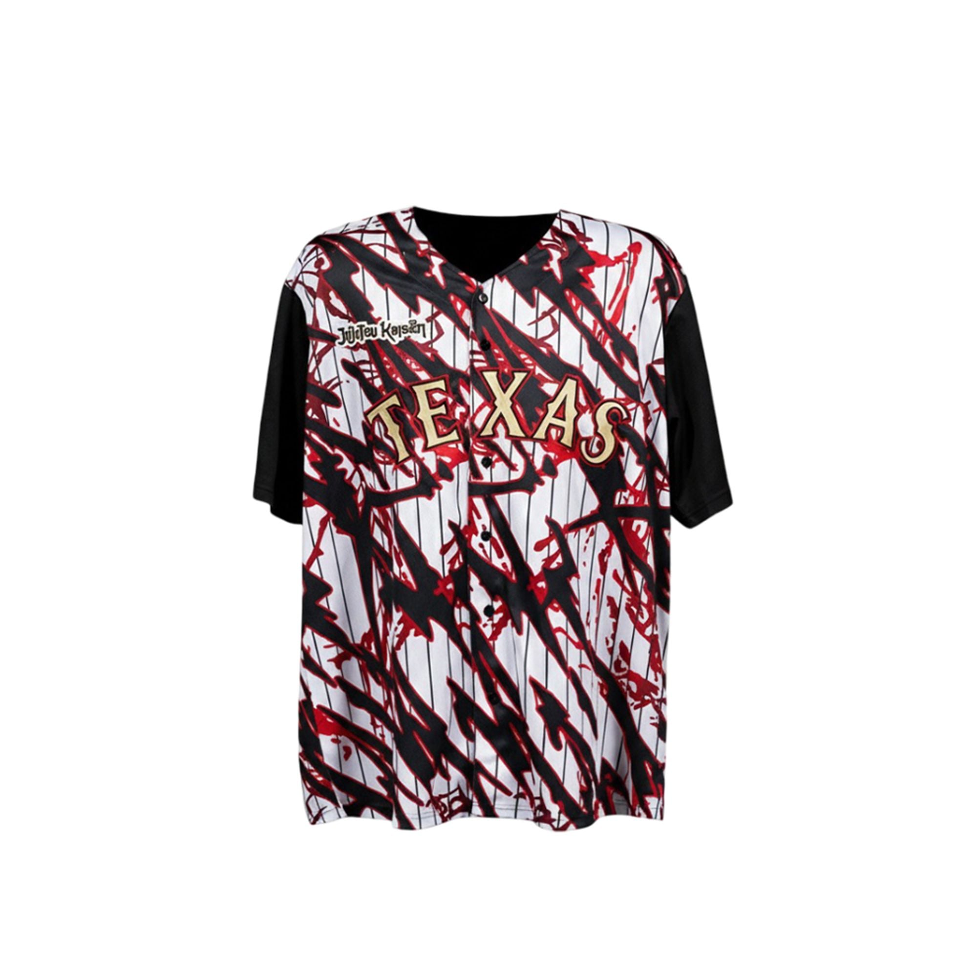 The front proudly displays “TEXAS” in a regal, championship-gold font, outlined in black to pop against the chaotic background. The Jujutsu Kaisen logo sits on the right chest, cementing the authenticity of the collaboration. On the back, the jersey features “ITADORI” and the number “26“—a dual reference to the current year and the iconic character—integrated seamlessly into the stripes and splashes. The solid black sleeves ground the design, giving it a modern streetwear silhouette that looks just as good on the streets of Arlington as it does at a convention.