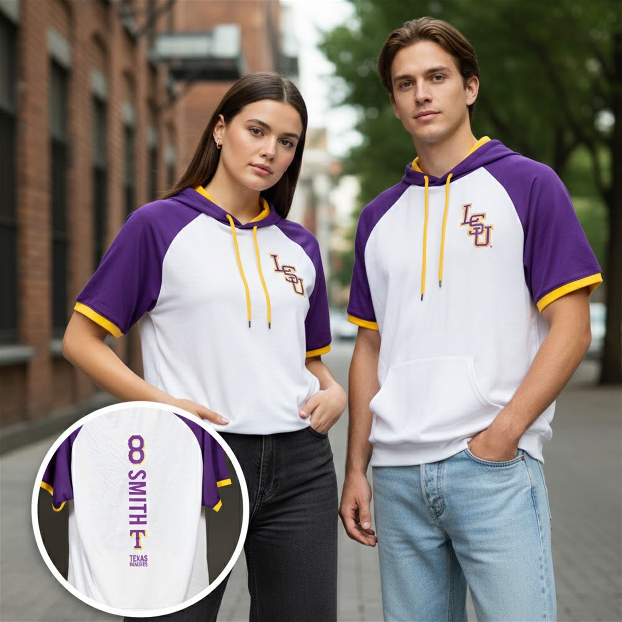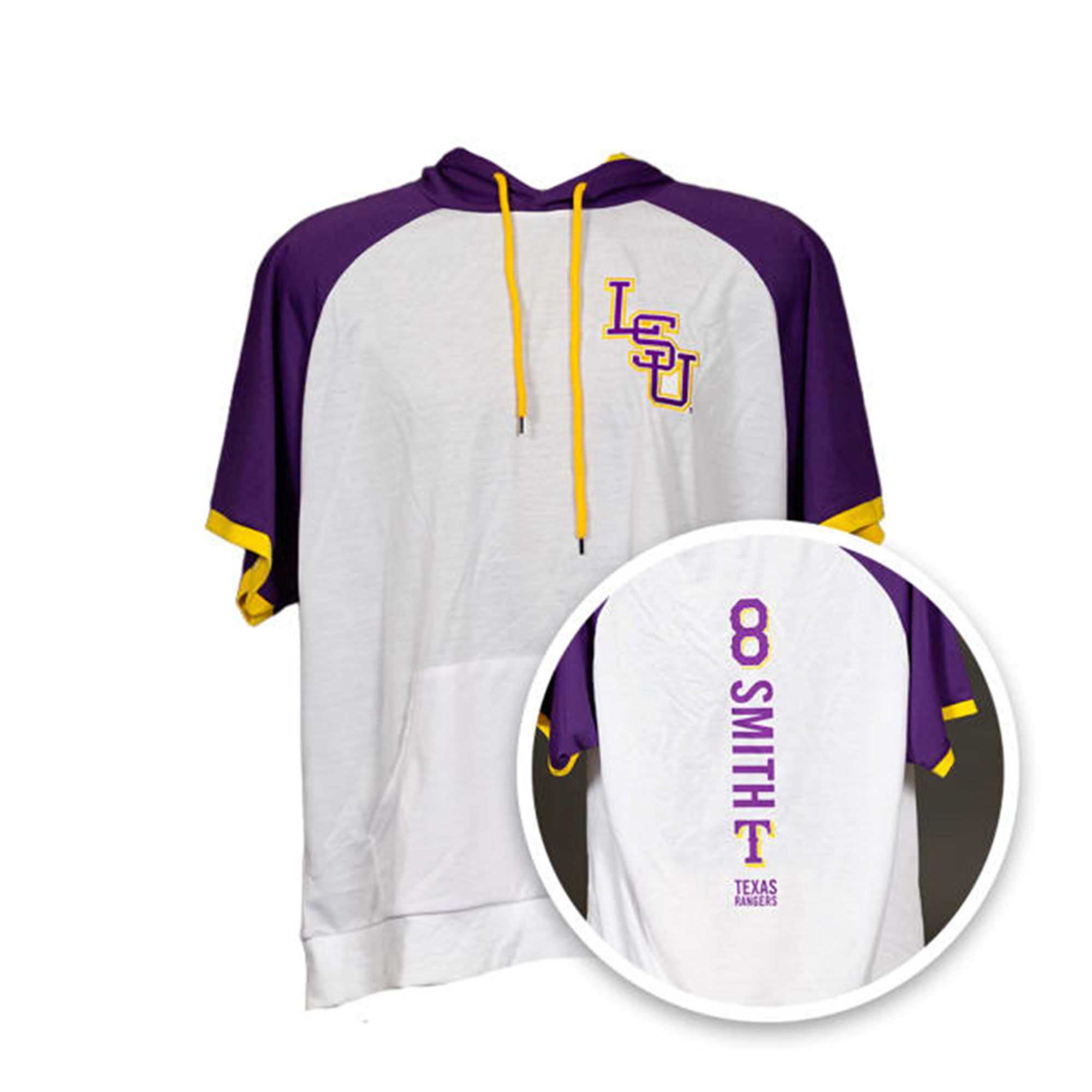 This specific piece of team gear brilliantly bridges two completely different worlds of baseball. The aesthetic relies heavily on striking visual contrast, utilizing the iconic purple and gold accents on the sleeves and drawstrings against a crisp, clean base. The bold, classic “LSU” lettering on the chest perfectly sets the stage, while the back features the unmistakable “8 SMITH” positioned elegantly above the Texas Rangers. It is a visual timeline of a player’s journey from collegiate dominance in the SEC to shining in the professional leagues, offering a unique narrative that standard team merchandise rarely achieves.