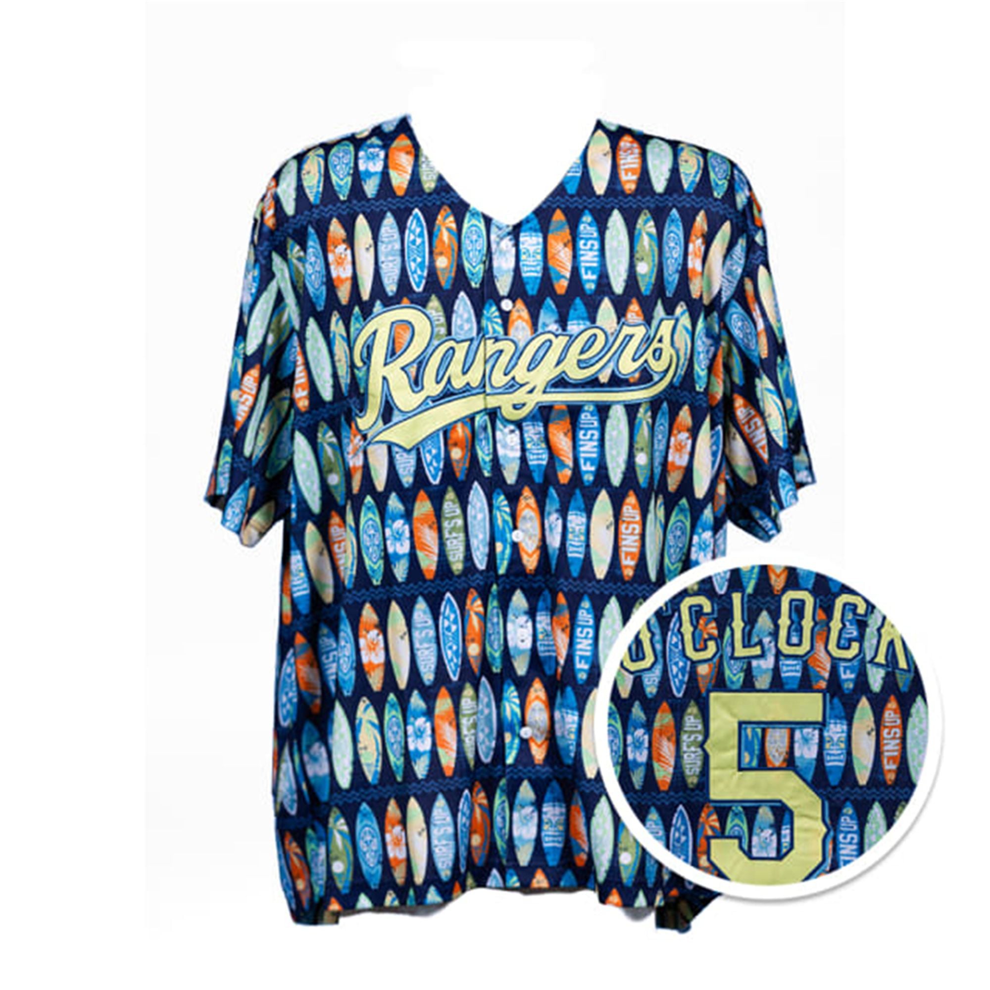 This promotional piece celebrates the beloved Margaritaville theme night, seamlessly blending the thrill of Texas Rangers baseball with a relaxed, beach-ready aesthetic. The front proudly displays the classic “Rangers” script over a deep blue backdrop teeming with an intricate pattern of multi-colored surfboards. Turn it around, and the jersey makes a bold statement with “5 O’CLOCK” arched over the number “5“—a clever homage to the timeless idea that it is always time to relax somewhere in the world. This design transcends typical sports merchandise, offering a wearable vacation state of mind.