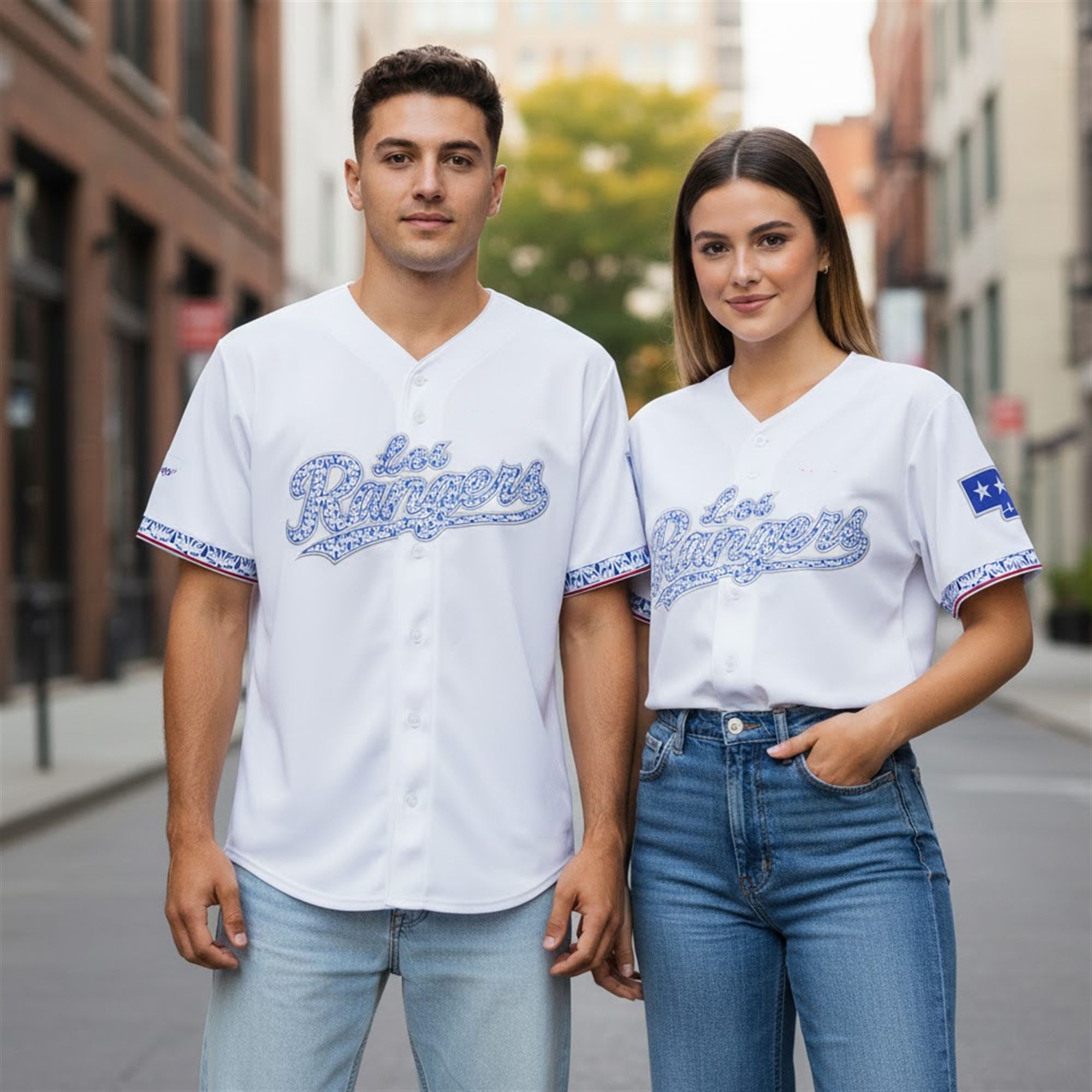 The jersey represents a monumental moment in sports apparel design, perfectly capturing the spirit of cultural celebration. The visual centerpiece of this garment is the striking “los Rangers” script emblazoned across the chest. Instead of standard team colors, the lettering is filled with a mesmerizing, intricate blue-and-white pattern highly reminiscent of traditional Mexican Talavera pottery or classic Azulejo tilework.