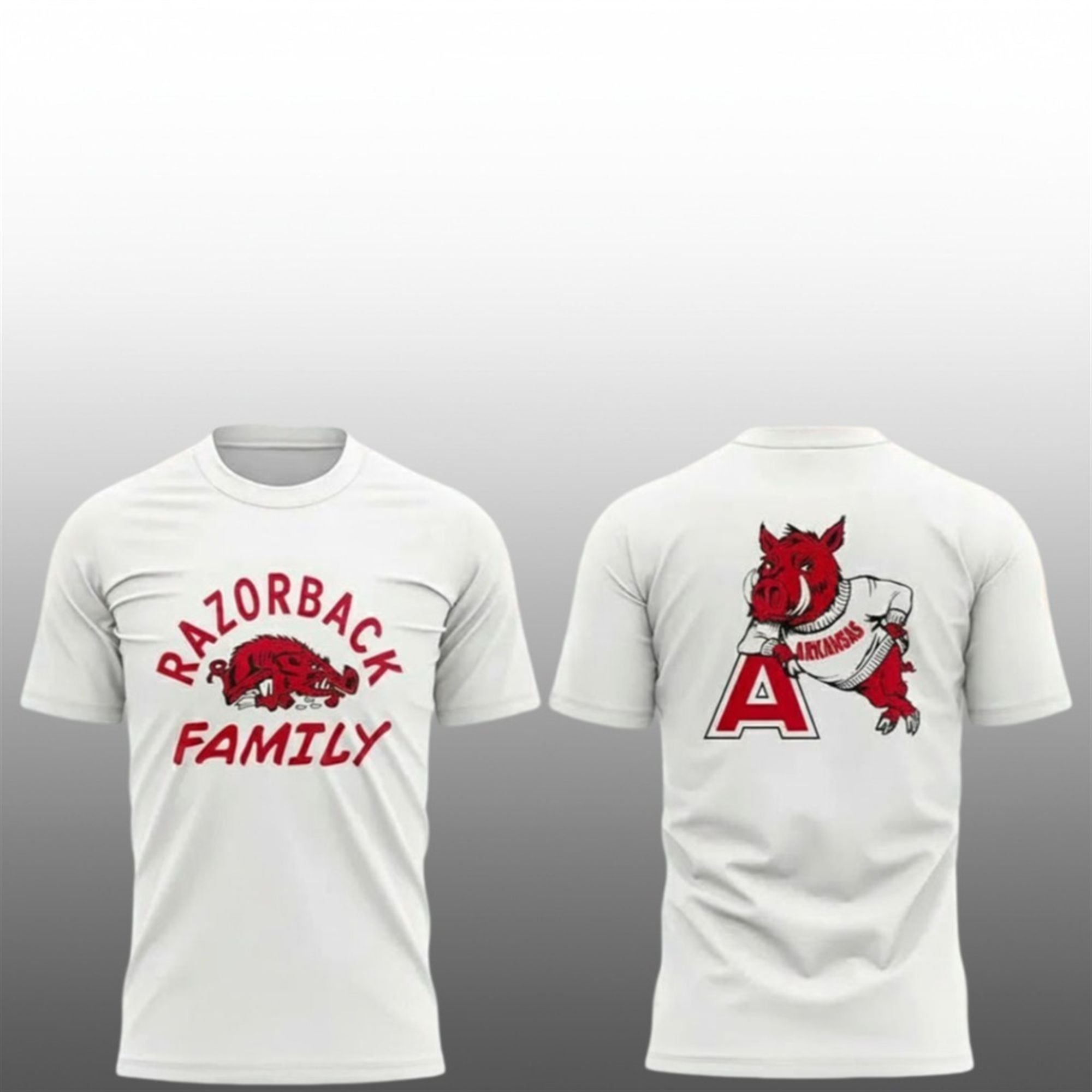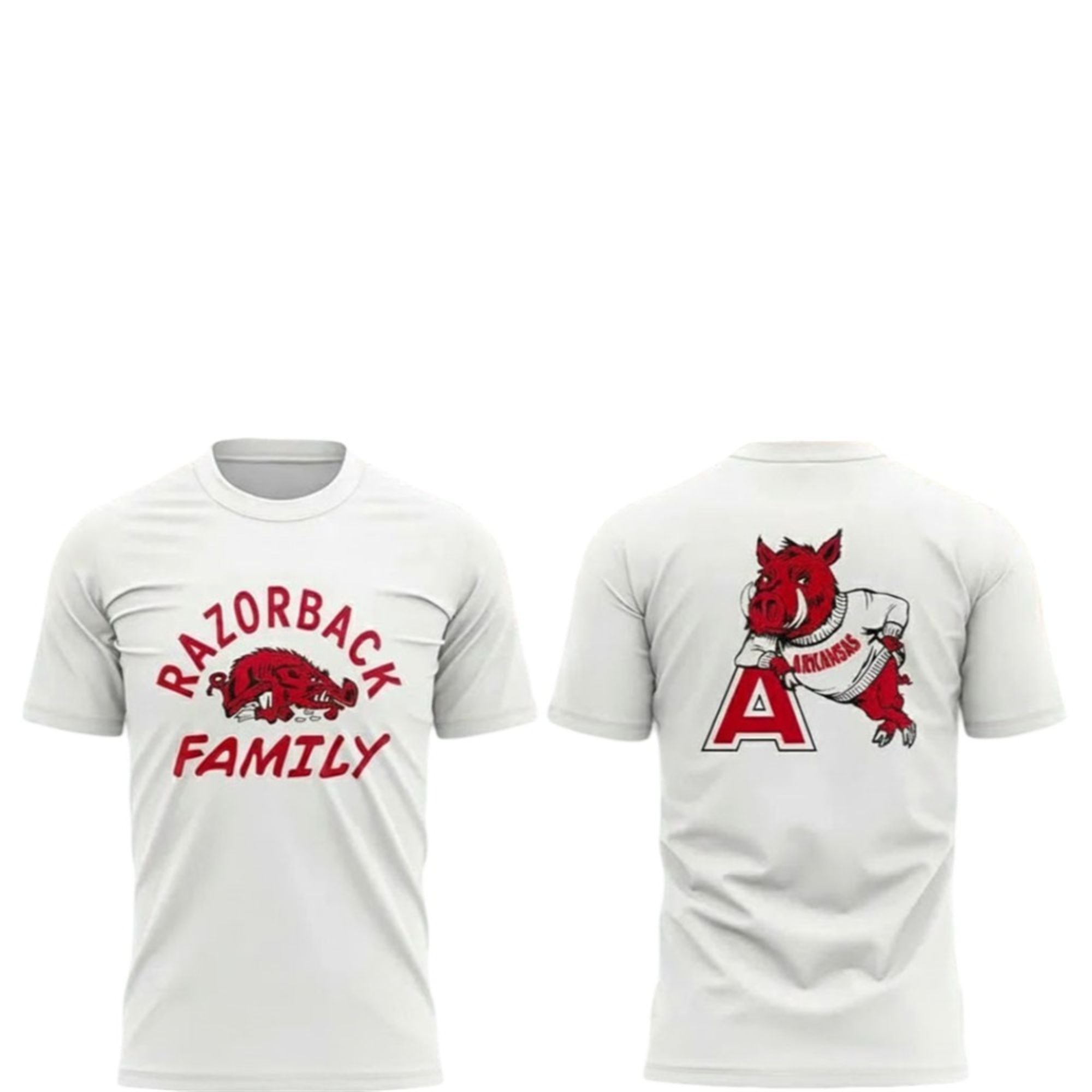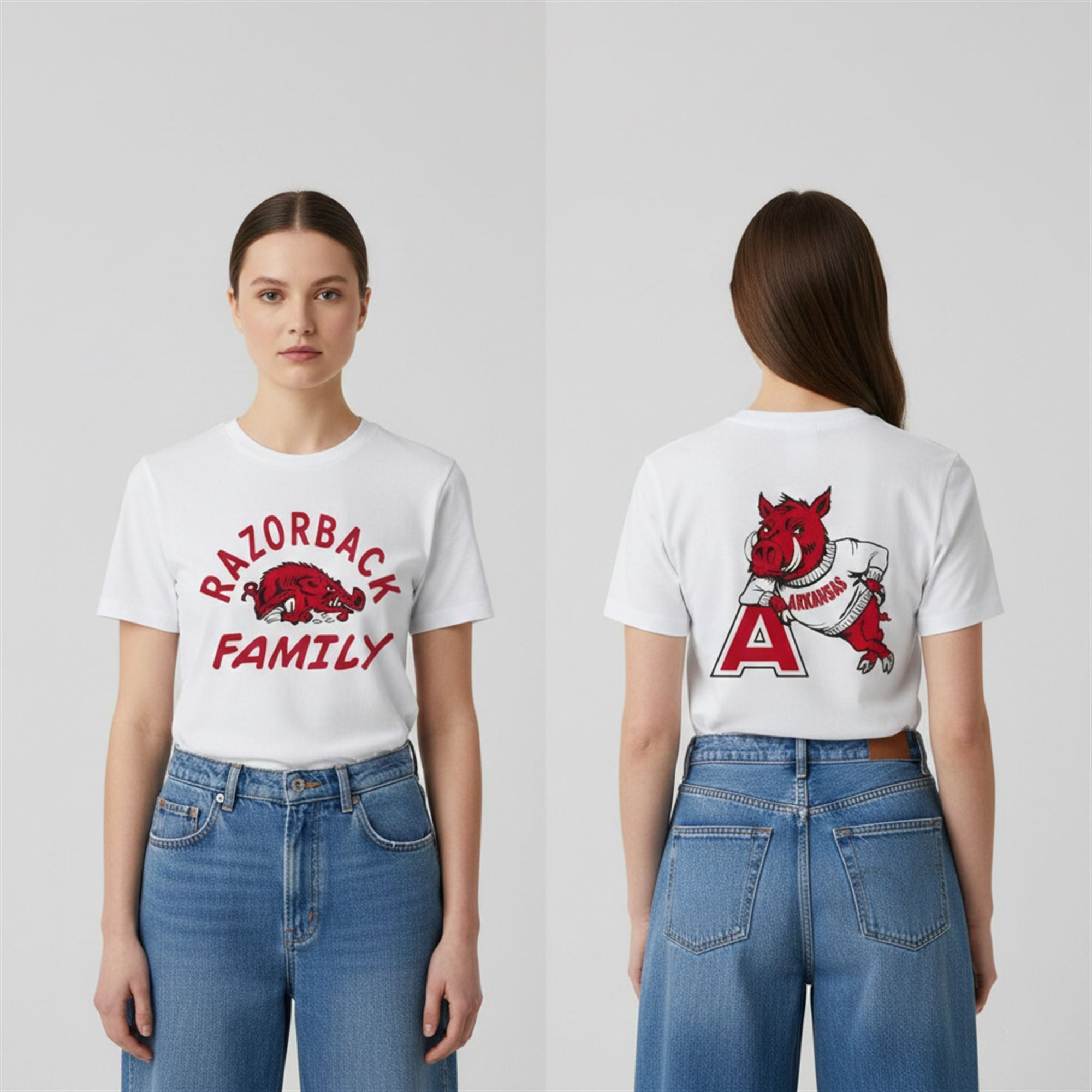 The Front: Bold Unity The chest features a clean, high-impact design centered around the phrase “RAZORBACK FAMILY.” The text arcs protectively over the classic running Razorback logo—the fierce, rushing hog that symbolizes the relentless drive of the team. This side of the shirt is all about immediate recognition and declaring your membership in the Hog fandom.