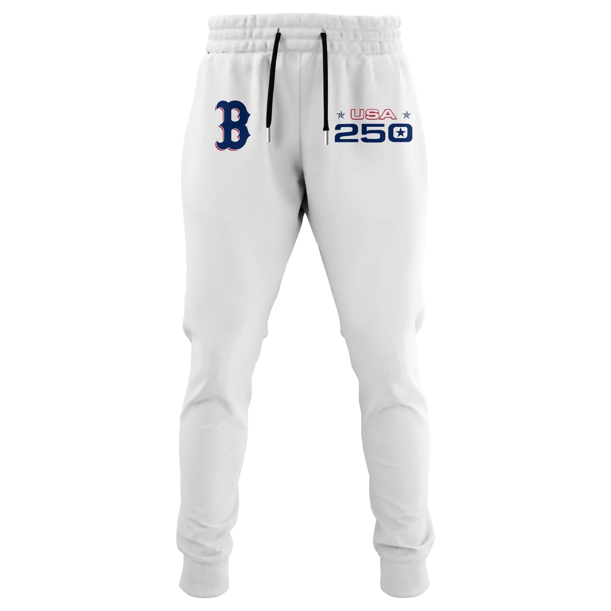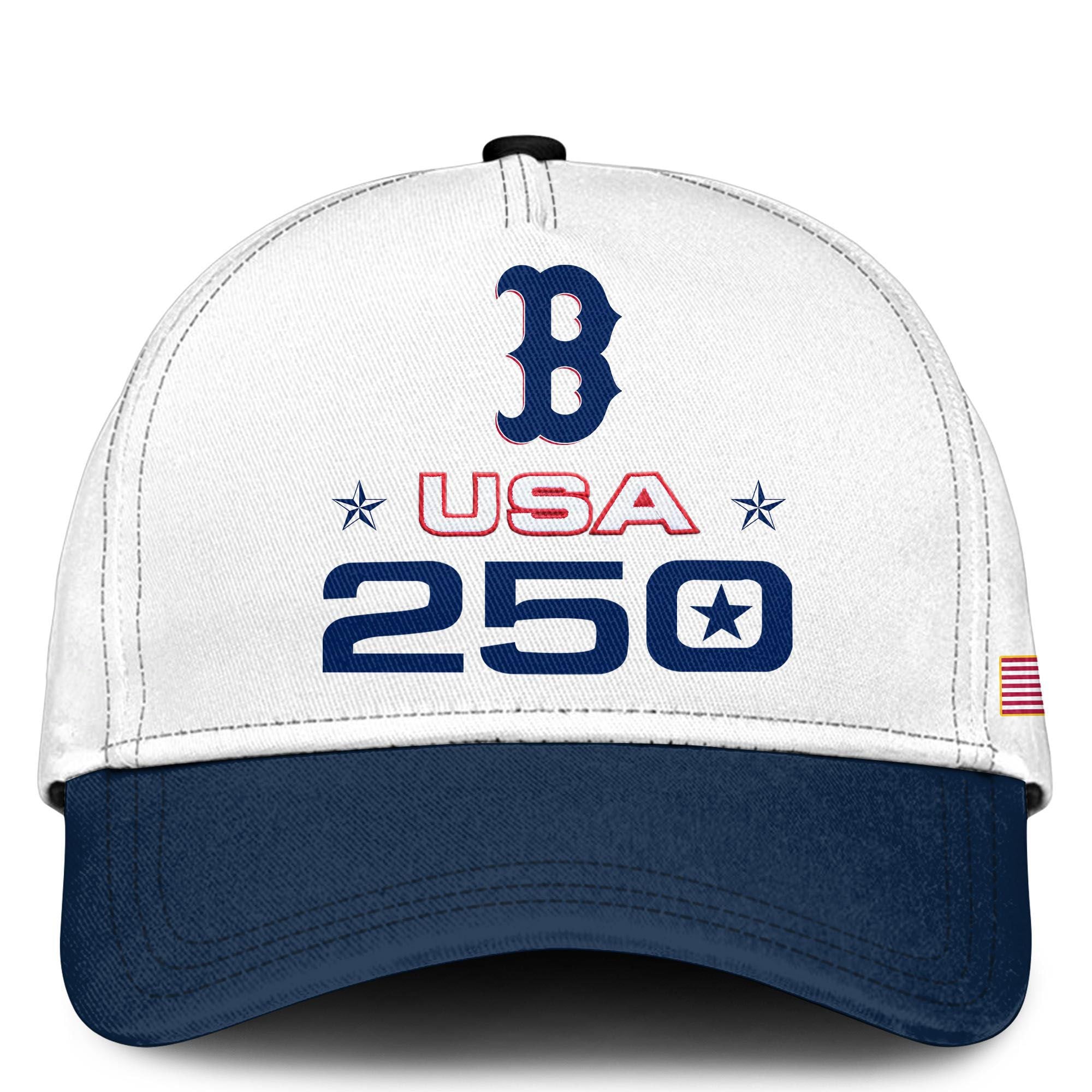 The Back: Makes a bold statement with “BOSTON” in Varsity-style red lettering, sitting above a stylized “USA” and a massive “250” graphic that incorporates the Red Sox star logo, ensuring your allegiance is visible from a distance.