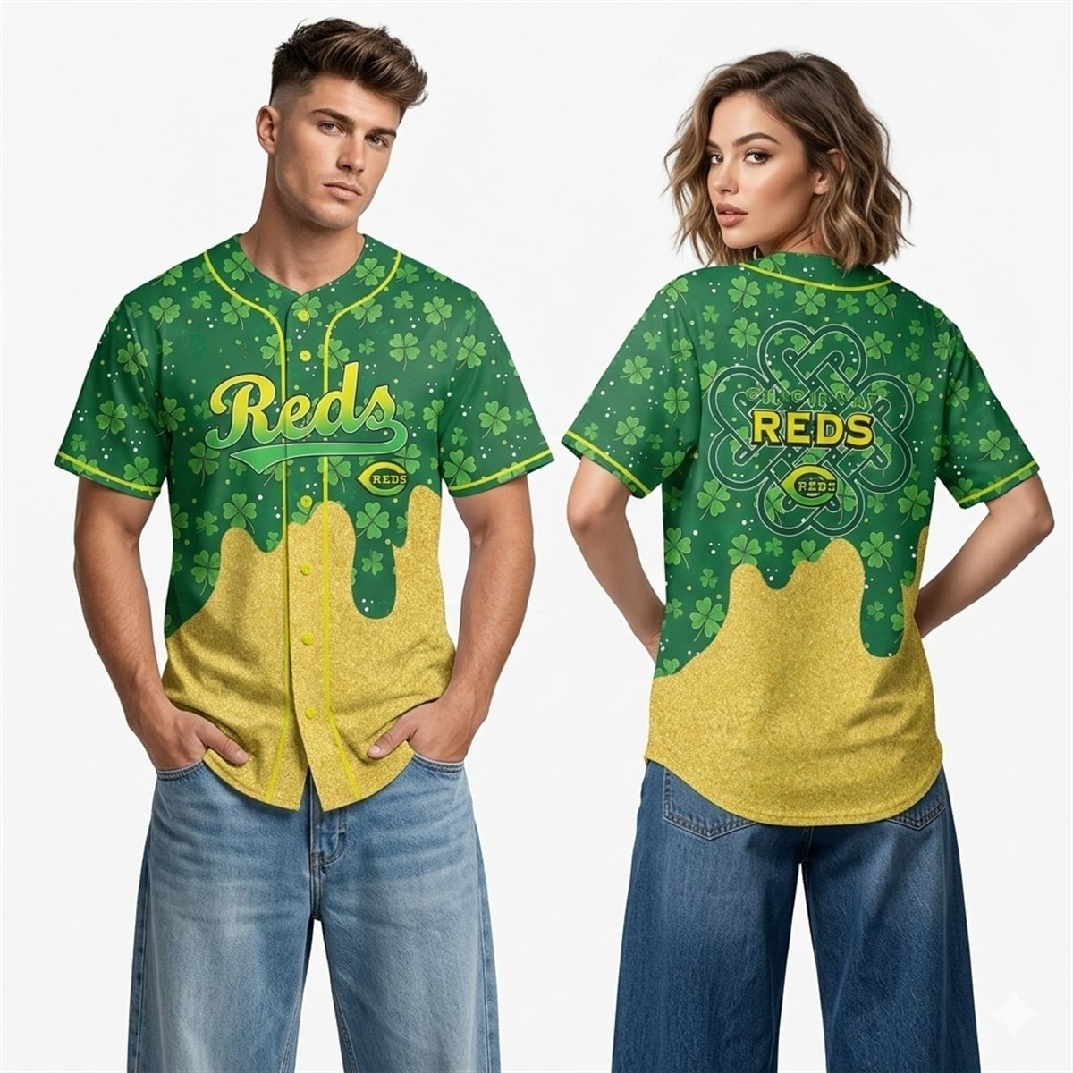 The striking visual contrast between the vivid shamrock canopy and the unexpected, shimmering golden “drip” effect instantly captured the attention of sports influencers across social media. Fans were immediately drawn to the clever integration of the traditional Celtic knot framing the iconic Cincinnati logo on the back of the garment. This bold, unconventional aesthetic completely broke the mold of standard, boring holiday sports apparel, prompting massive sharing and discussion across local online fan groups. As a result of this digital buzz, it quickly became the definitive, must-have statement piece for anyone attending spring festivities in the region.
