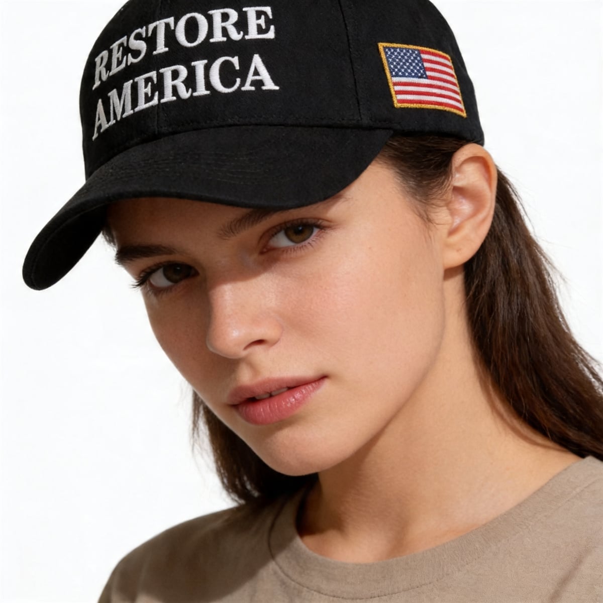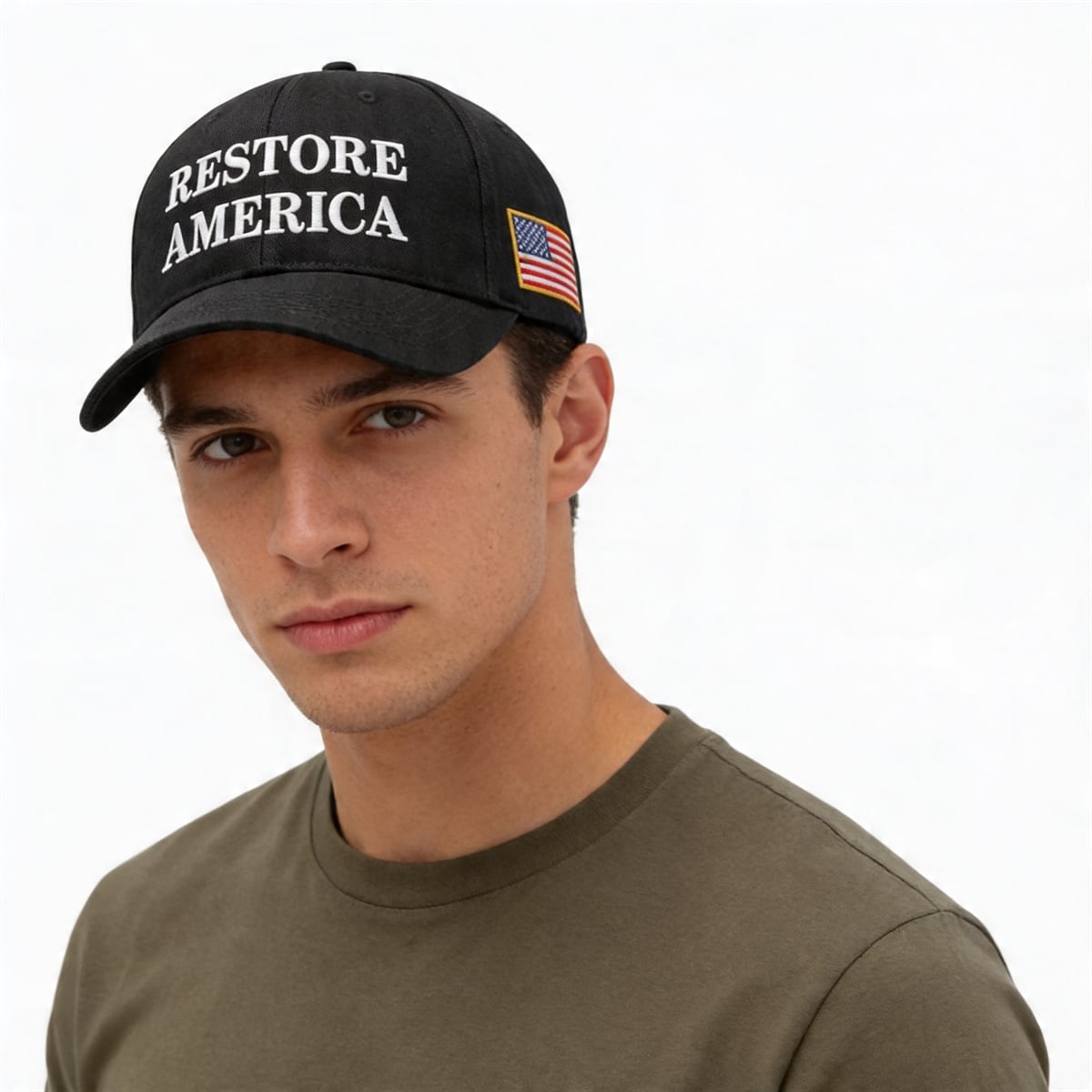 The phrase “Restore America” carries profound significance in the current cultural zeitgeist. It represents a philosophical desire to return to foundational constitutional principles, revive national pride, and prioritize domestic strength. Wearing this phrase signals a belief in American exceptionalism and a call to action for voters who feel an urgent need to guide the country back to its historical roots. The addition of the side-mounted American flag further cements this meaning, ensuring that the message of “restoration” is fundamentally tied to a love of country and a respect for the liberties the flag represents.