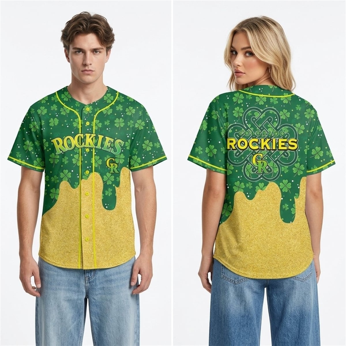 The jersey is a masterclass in thematic sports apparel. Moving away from standard holiday merchandise, this design introduces a high-contrast “Gold Drip” element that mimics a pot of gold overflowing from the hem. The upper half is drenched in a vibrant Kelly Green, adorned with a sophisticated shamrock pattern and a centralized Celtic knot that frames the legendary “Rockies” wordmark.