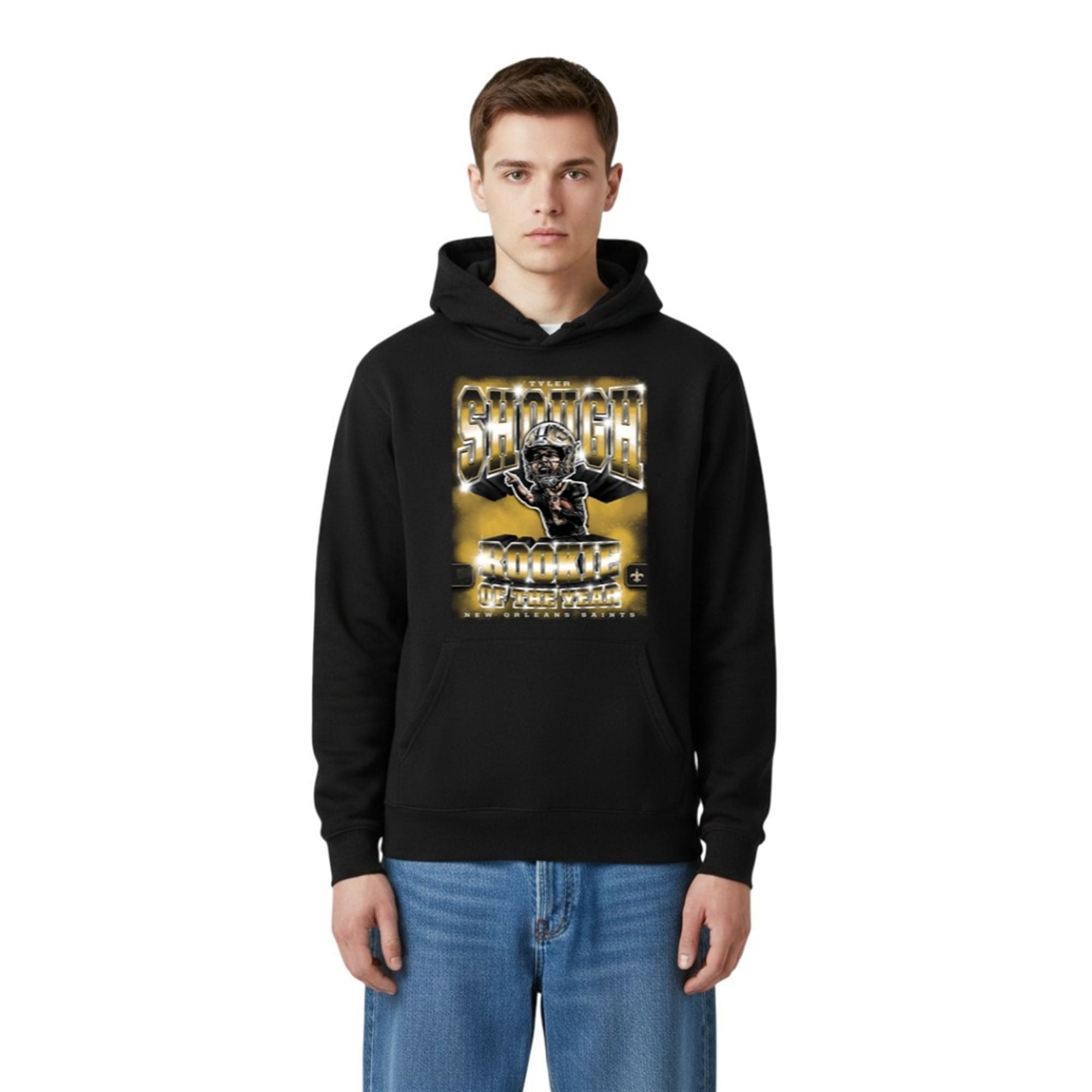 The shirt is a visual explosion of pride, designed to match the high-octane energy of the Saints’ latest offensive resurgence. Drawing deep inspiration from the iconic “Bling Era” of New Orleans hip-hop history, the design features a larger-than-life caricature of Shough commanding the field, framed by massive, diamond-encrusted typography that reads “ROOKIE OF THE YEAR.”