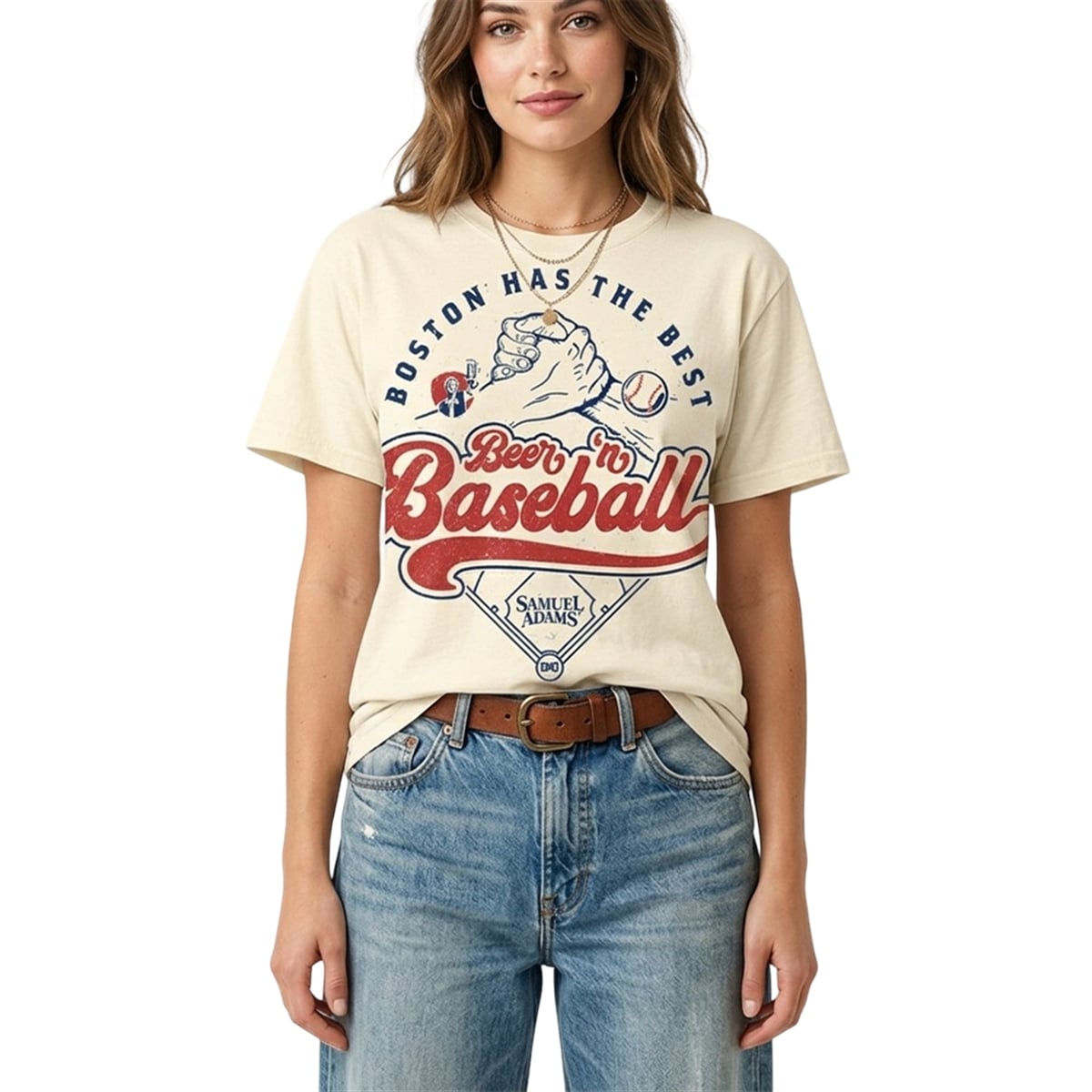 To anchor the entire design, a classic baseball diamond is placed at the bottom, proudly displaying the iconic Samuel Adams logo right at home plate. The distressed, retro aesthetic gives it the look of a cherished heirloom from decades past, cleverly updated to commemorate the excitement of the modern 2026 season. It is a brilliant piece of wearable pop art that seamlessly merges two of the city’s most famous exports into one cohesive, stylish statement.