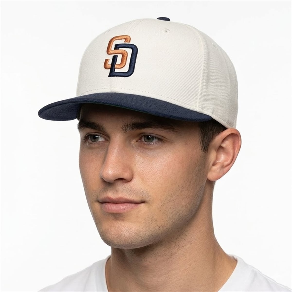 The hat redefines sports fashion with a striking visual contrast. Featuring a pristine, off-white crown paired beautifully with a deep navy blue brim, this cap serves as a vibrant canvas for the iconic San Diego Padres “SD” emblem.