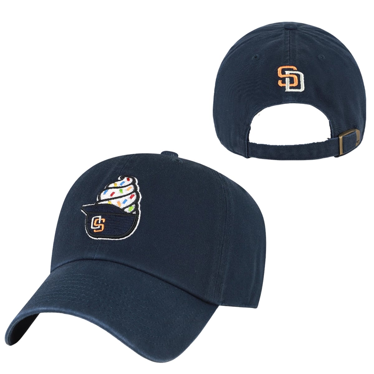 The hat is a brilliant fusion of classic sports aesthetics and lighthearted pop culture. Featuring a deep navy blue base, this cap immediately draws the eye to its cleverly embroidered centerpiece: a swirl of vanilla soft-serve ice cream, complete with colorful sprinkles, sitting perfectly inside a miniature Padres batting helmet. The classic interlocking San Diego Padres “SD” logo is prominently displayed in a striking orange and white combination on both the miniature helmet and the back of the cap. Complete with an adjustable metal sliding buckle for a customized fit, this hat beautifully balances the traditional look of baseball fandom with a completely unexpected, whimsical twist.
