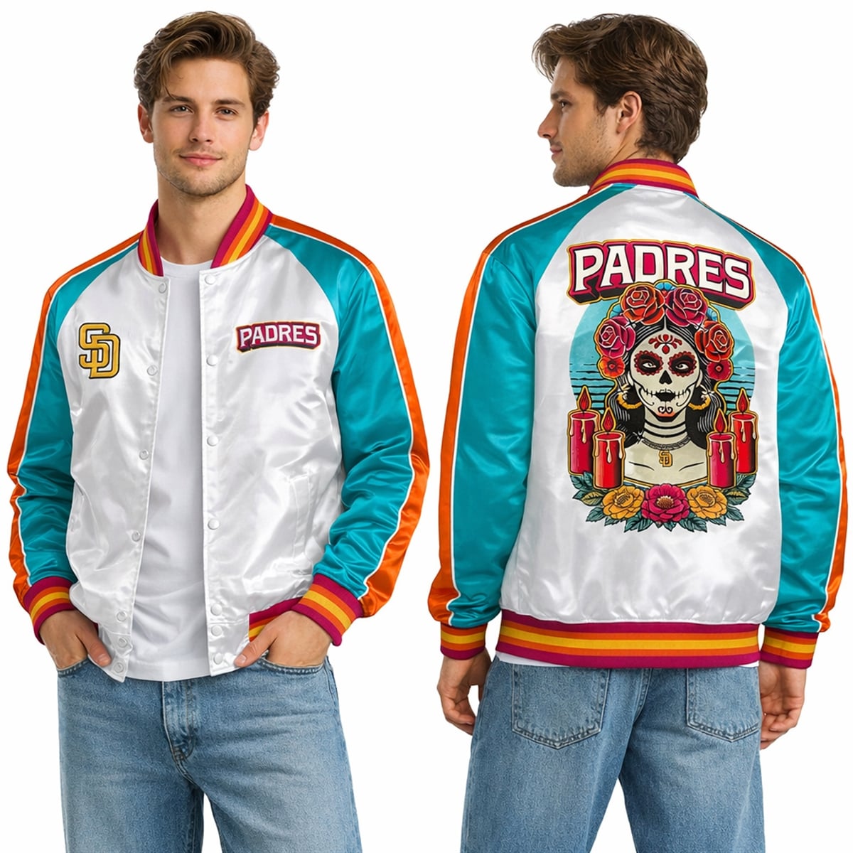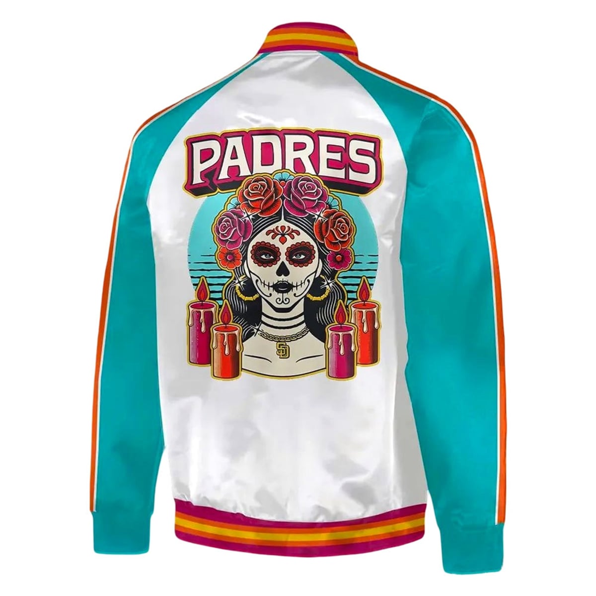 The Calavera symbolizes the beautiful, continuous cycle of life and memory, stripping away fear and replacing it with joyful remembrance. The lit candles surrounding the figure represent the guiding light that helps ancestors find their way back to the living world during the celebration. By integrating these powerful cultural symbols with the Padres’ electrifying City Connect color palette, the jacket becomes a unified emblem of familial love, historical reverence, and unyielding baseball loyalty.