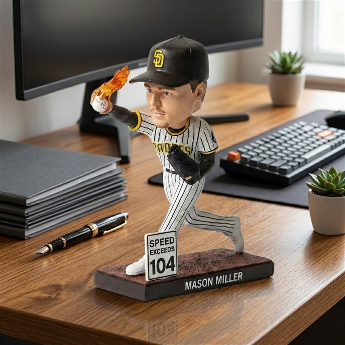 This striking collectible freezes Mason Miller in the middle of his signature, high-octane delivery. Dressed in the classic San Diego Padres home pinstripe uniform with the iconic “SD” logo on his dark cap, the figure leans forward with intense focus. The true highlight of the design is the baseball resting in his right hand, which is sculpted with vibrant, translucent orange and yellow flames trailing behind it, simulating the blazing speed of his pitches. At his feet, planted firmly on a dirt-styled pitcher’s mound, sits a miniature white and black street sign that reads “SPEED EXCEEDS 104.” The front of the base proudly displays “MASON MILLER” in bold white lettering, completing the stadium-ready look.
