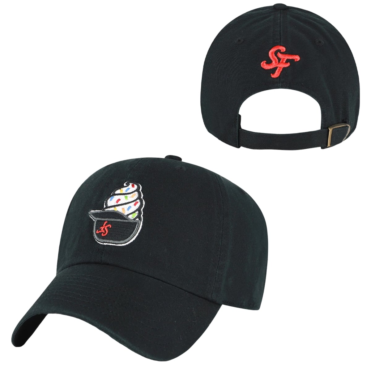 The hat is a masterclass in striking visual contrast and playful design. The foundation of the cap is a sleek, deep black, providing the perfect dark canvas to make the front embroidery pop. The centerpiece is a vibrant, detailed depiction of a classic baseball stadium treat: a swirl of soft-serve ice cream, dotted with colorful sprinkles, sitting perfectly inside a miniature black batting helmet. This tiny helmet features a striking red interlocking San Francisco Giants “SF” logo, mirroring the actual helmets worn by the players.