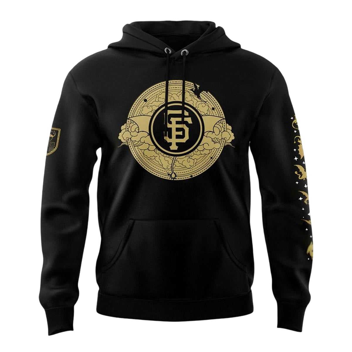 The front of the garment showcases the iconic interlocking San Francisco Giants “SF” logo, ingeniously reimagined. It sits at the center of an ancient-looking, circular golden crest, flanked by the protective wings of dragons. Moving to the back, the design explodes into a massive, majestic golden dragon in mid-flight, surrounded by victory laurels, celestial stars, and magical phases of the moon. Even the sleeves are adorned with striking celestial elements and falling stars, completing the enchanting look.