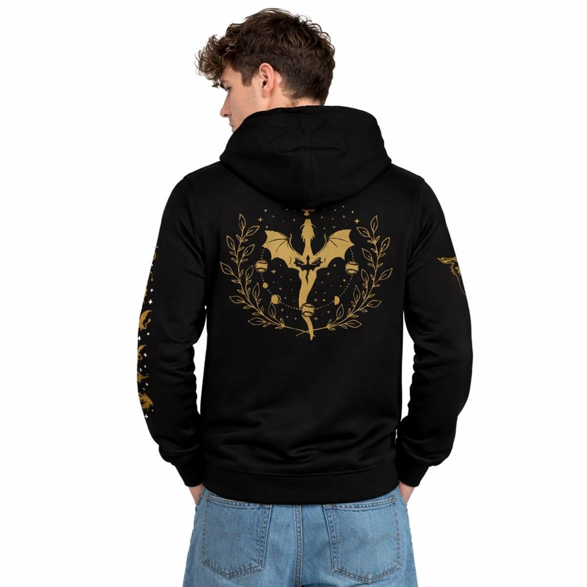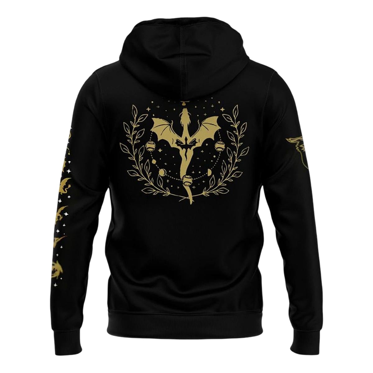 The sprawling dragon on the back is a direct homage to the formidable beasts of the Fourth Wing universe, symbolizing power, intuition, and untamed magic. The surrounding celestial bodies—the stars and moon phases cascading down the sleeves and framing the back—nod to the night sky where the dragons soar, while the laurel branches represent victory, triumph, and survival in the grueling challenges of both the War College and the baseball diamond.