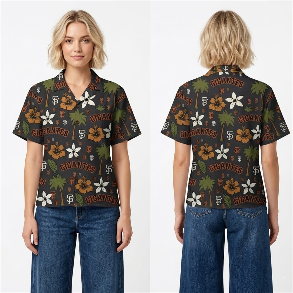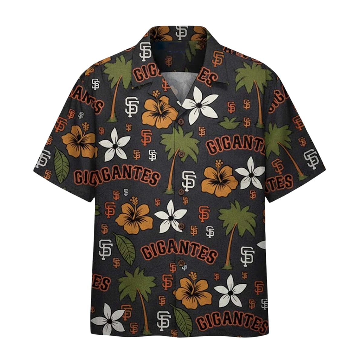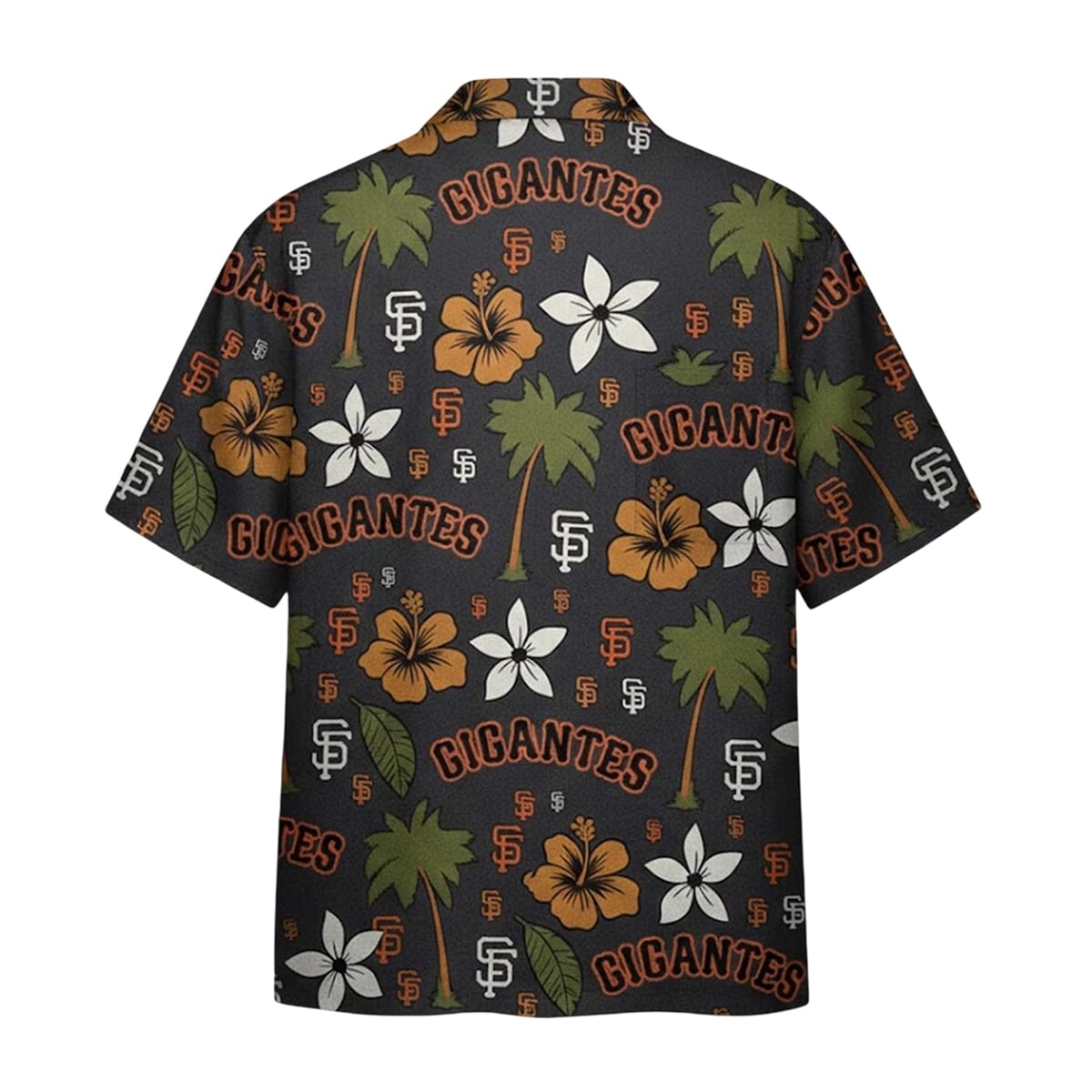 The shirt is a masterclass in striking visual design and team spirit. Set against a deep, dark backdrop, the shirt bursts to life with classic Hawaiian shirt motifs carefully integrated with iconic baseball branding. Lush green palm trees and vibrant orange and white hibiscus flowers are meticulously scattered across the canvas. Intertwined within this tropical paradise are the unmistakable classic San Francisco Giants “SF” logos and the bold “GIGANTES” typography. This visually arresting combination creates a dynamic contrast that immediately catches the eye, making it a standout piece in any collection of sports apparel.
