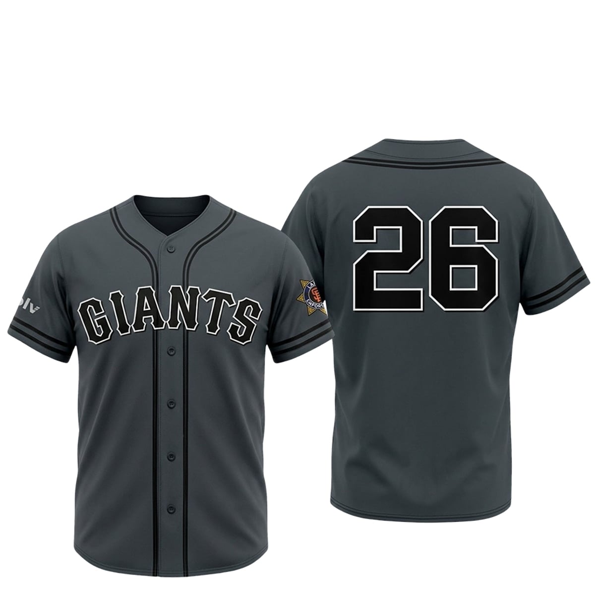 The back of the jersey proudly bears the number “26,” celebrating the 2026 season and serving as a time capsule for this specific giveaway event. Adding to its exclusivity is the custom commemorative patch located on the left sleeve. This intricate emblem incorporates classic law enforcement heraldry merged seamlessly with Giants iconography, making it an instant classic among fans and collectors alike.