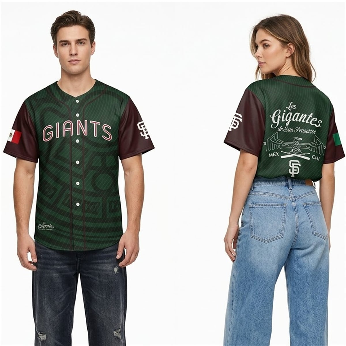 The jersey is a triumph of design and representation. Moving away from the traditional orange and black, this edition introduces a sophisticated color palette featuring a deep, forest green torso contrasted by rich, burgundy sleeves. The front proudly displays the classic “GIANTS” lettering, reimagined with a burgundy outline, layered over a subtle, mesmerizing background pattern inspired by ancient Mesoamerican geometry.
