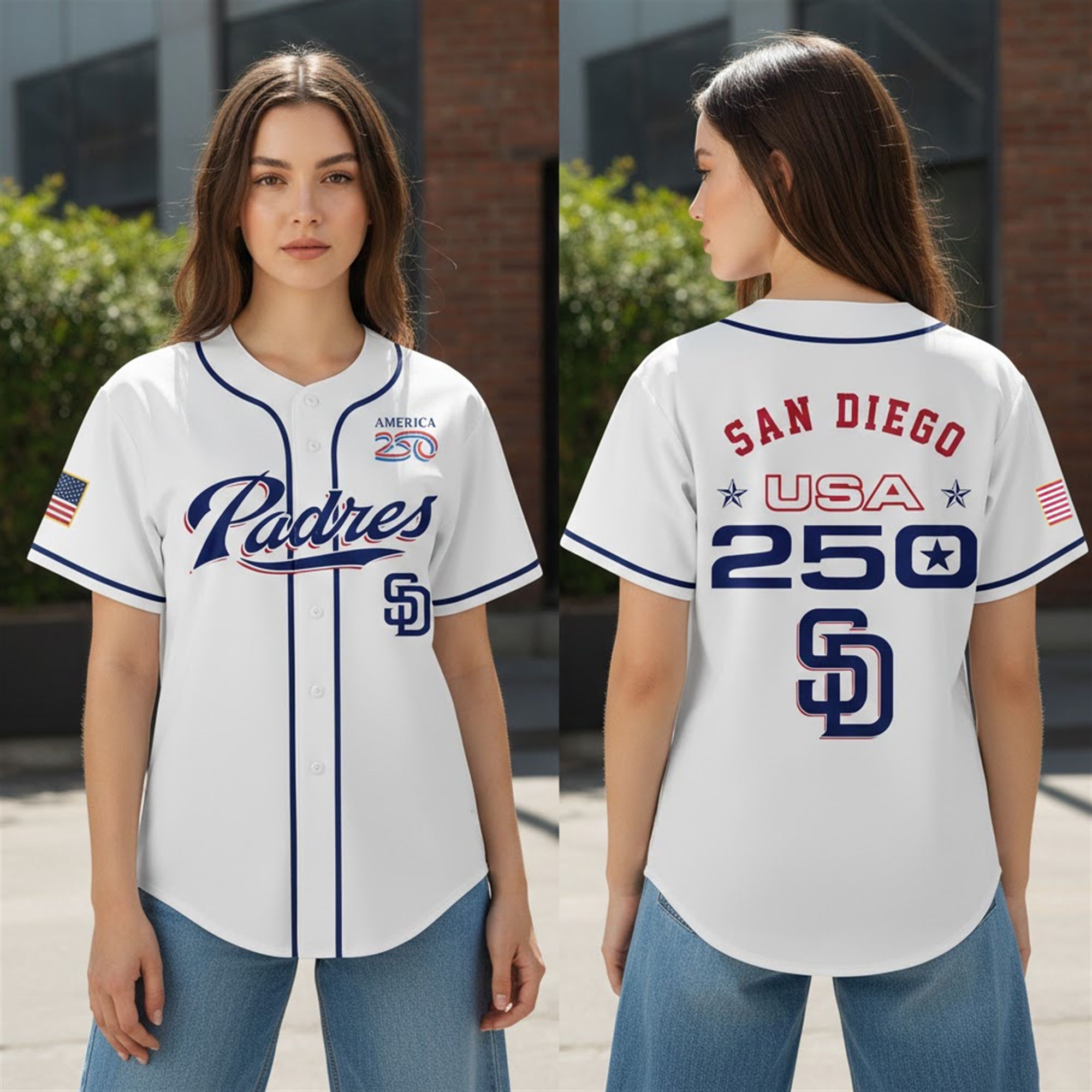 The centerpiece of this collection is the striking design that redefines the Padres’ visual language for this historic year. The jersey features the classic “Padres” script across the chest, underlined in a deep patriotic red, flanked by the “America 250” emblem. The clean white base serves as a canvas for the bold navy and red accents, ensuring the team colors pop with national pride. On the back, the “SAN DIEGO” wordmark arches proudly over a massive “USA 250” graphic, where the zero is perfectly punctuated by a lone star—symbolizing unity and excellence.