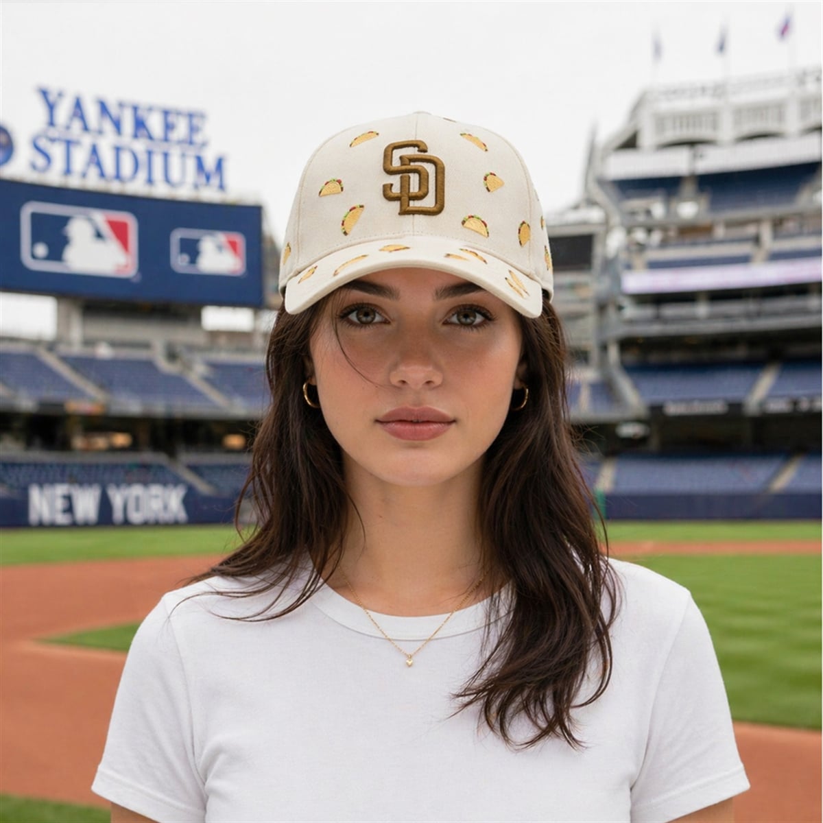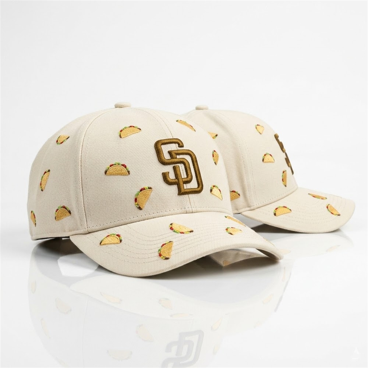 The hat is a visually striking piece of sports apparel designed specifically for the upcoming Mbaseball season’s promotional lineup. The design features a clean, neutral beige background that makes the iconic, interlocking brown and gold “SD” Padres logo pop right at the center of the crown. Surrounding the classic team insignia is a playful, all-over print of colorful taco graphics. This unique aesthetic directly bridges the gap between traditional sports merchandise and modern, trendy streetwear, ensuring fans stand out in the stadium crowd.
