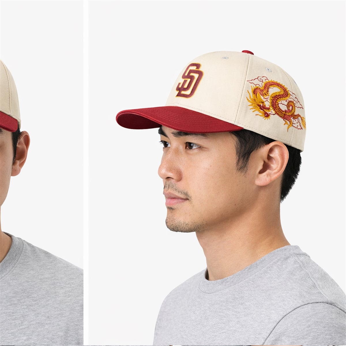 This remarkable piece of headwear was introduced as the visual centerpiece of the San Diego Padres’ 2026 Vietnamese Heritage Celebration. The cap features a striking two-tone aesthetic, combining a crisp cream-colored crown with a vibrant crimson brim and matching top button. On the front, the legendary San Diego Padres “SD” logo proudly sits in deep red, outlined in a brilliant gold that catches the eye. The true showstopper, however, rests on the right side panel: a magnificent, intricately styled traditional dragon soaring gracefully through stylized clouds. This design serves as a wearable tribute, seamlessly fusing the electric atmosphere of baseball with the profound legacy of the Vietnamese community.