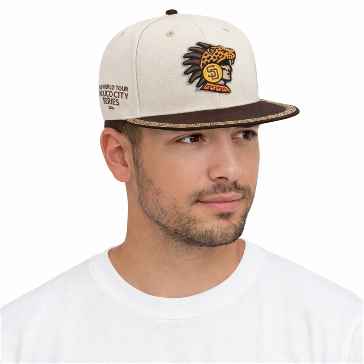 The hat is a commemorative visual masterpiece celebrating the Padres‘ participation in the international series. Visually, the cap presents a striking contrast with a clean, light-colored crown and a rich, deep brown brim. The side profile proudly displays the “World Tour Mexico City Series 2026” wordmark, instantly identifying it as an exclusive event-specific item. However, the true centerpiece is the reimagined team crest on the front panels. Moving away from standard team logos, this edition introduces a beautifully embroidered indigenous warrior profile, creating a powerful fusion of San Diego baseball identity and the profound historical roots of the host nation. The design is framed perfectly by a geometric pre-Columbian pattern detailing the edge of the brim, unifying the entire aesthetic.