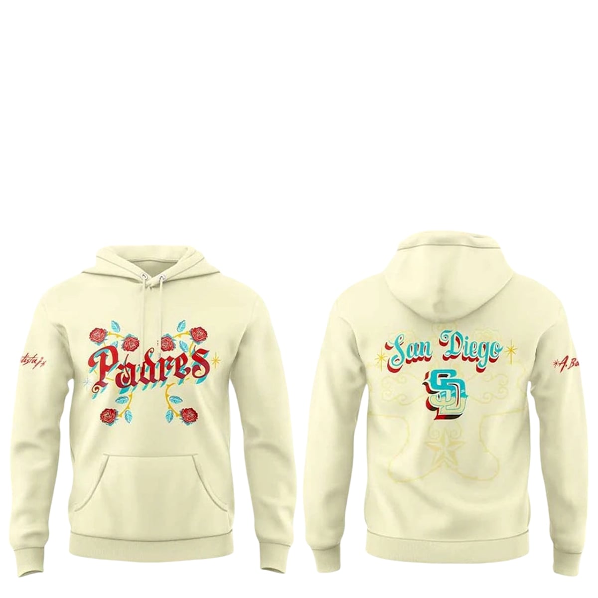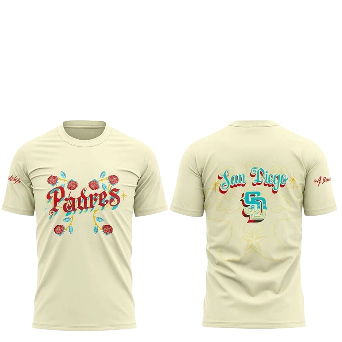 The shirt is a masterclass in sports graphic design, created specifically to honor the team’s international play in April 2026. Set against a striking cream-colored base, the garment operates as a canvas for a stunning array of cultural and athletic symbolism. The front features the word “Padres” in a stylized, vintage-inspired red and blue typography, beautifully intertwined with vivid red roses and contrasting blue leaves.