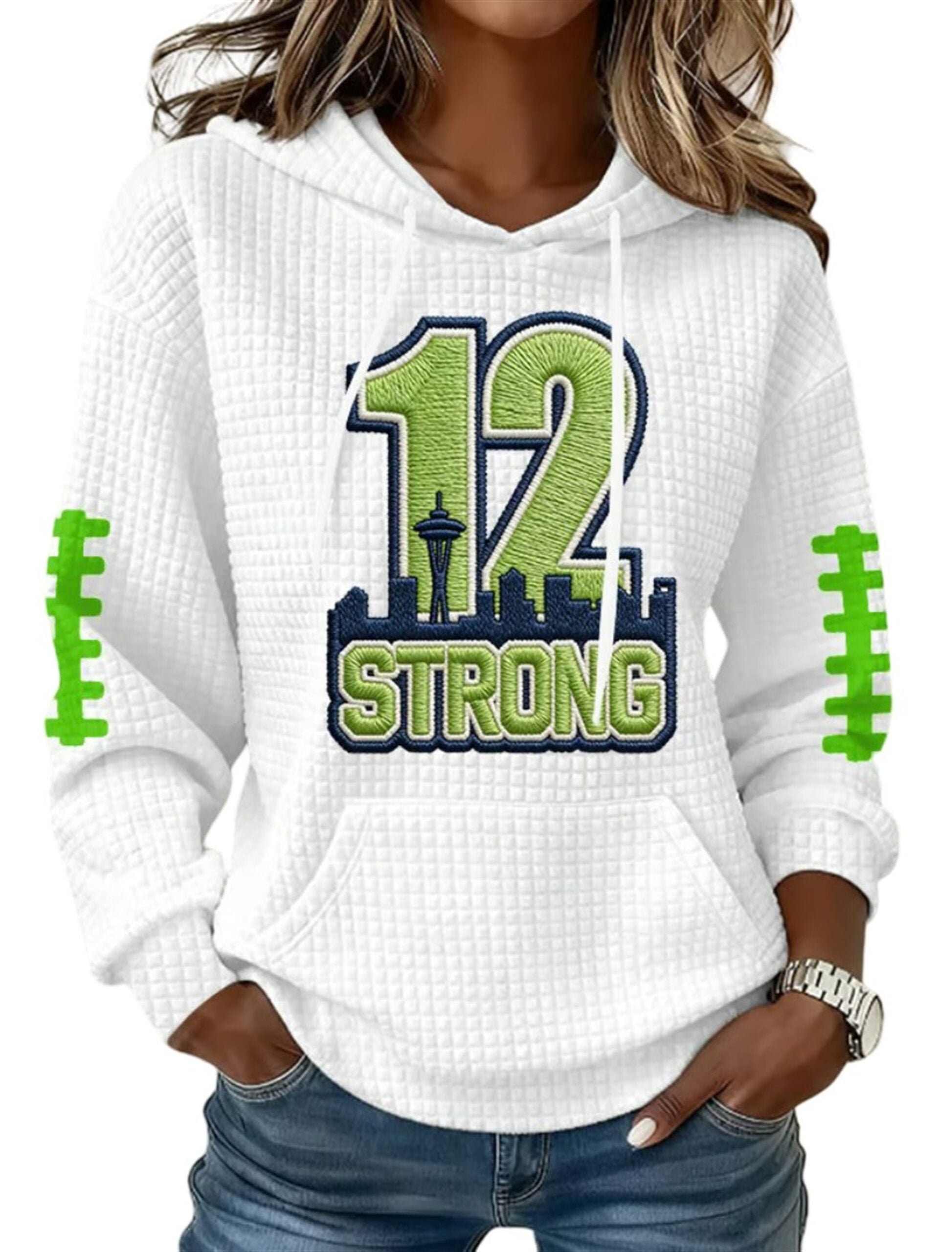 The hoodie is a masterclass in visual storytelling for sports fans. The centerpiece of the design is the massive, style “12“—the sacred number of Seattle’s fanbase. Uniquely, the number “1” is reimagined as the Space Needle, grounding the team’s identity firmly in the heart of the city. Below this, a navy silhouette of the downtown skyline creates a rugged foundation for the bold “STRONG” text, symbolizing the resilience of the fan base.