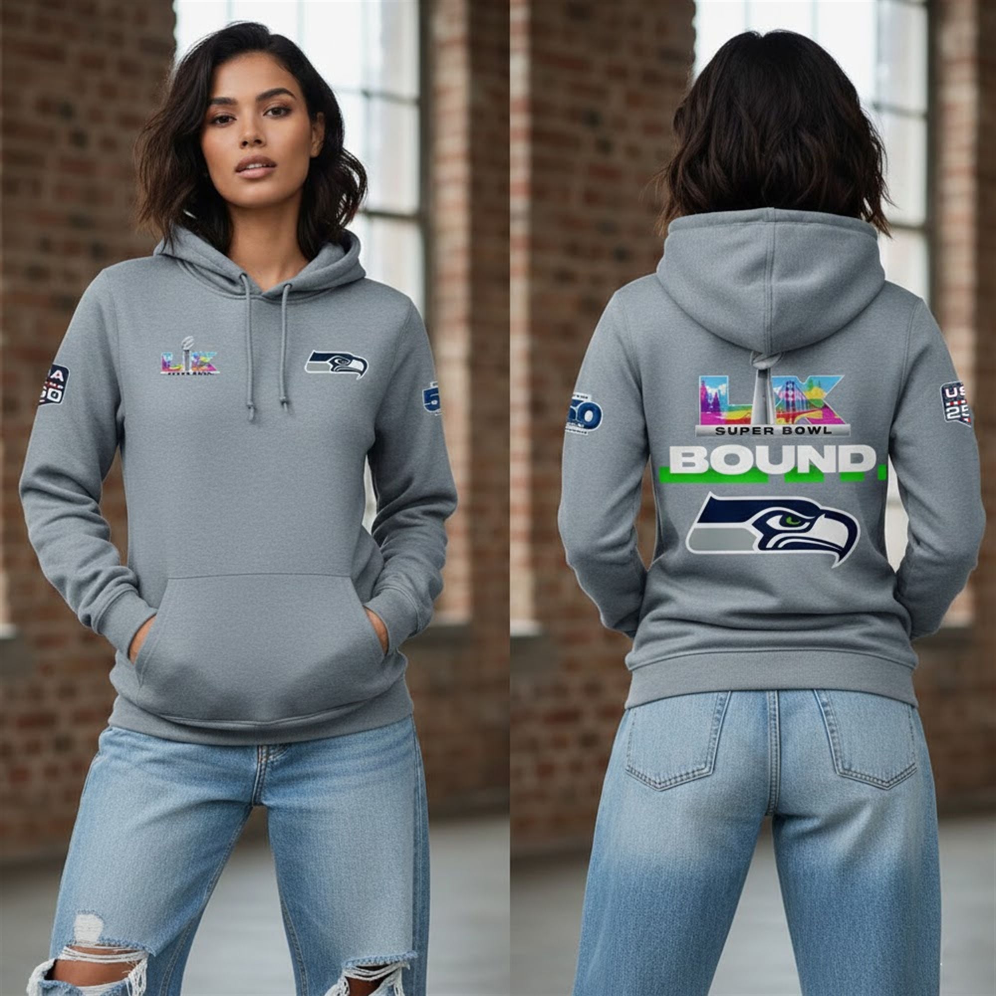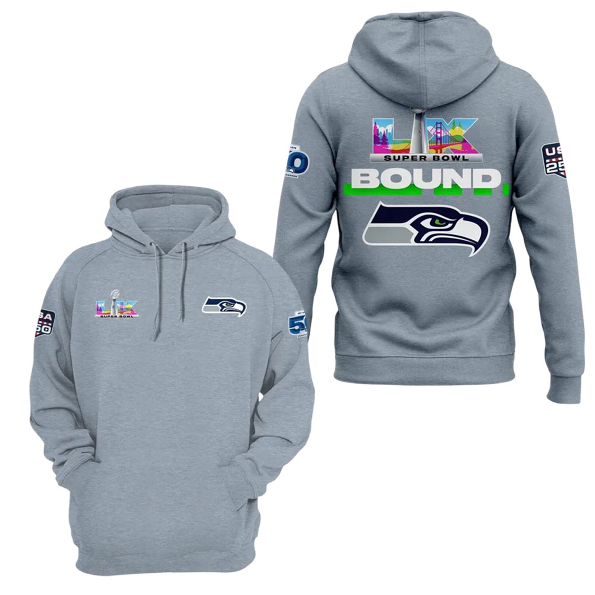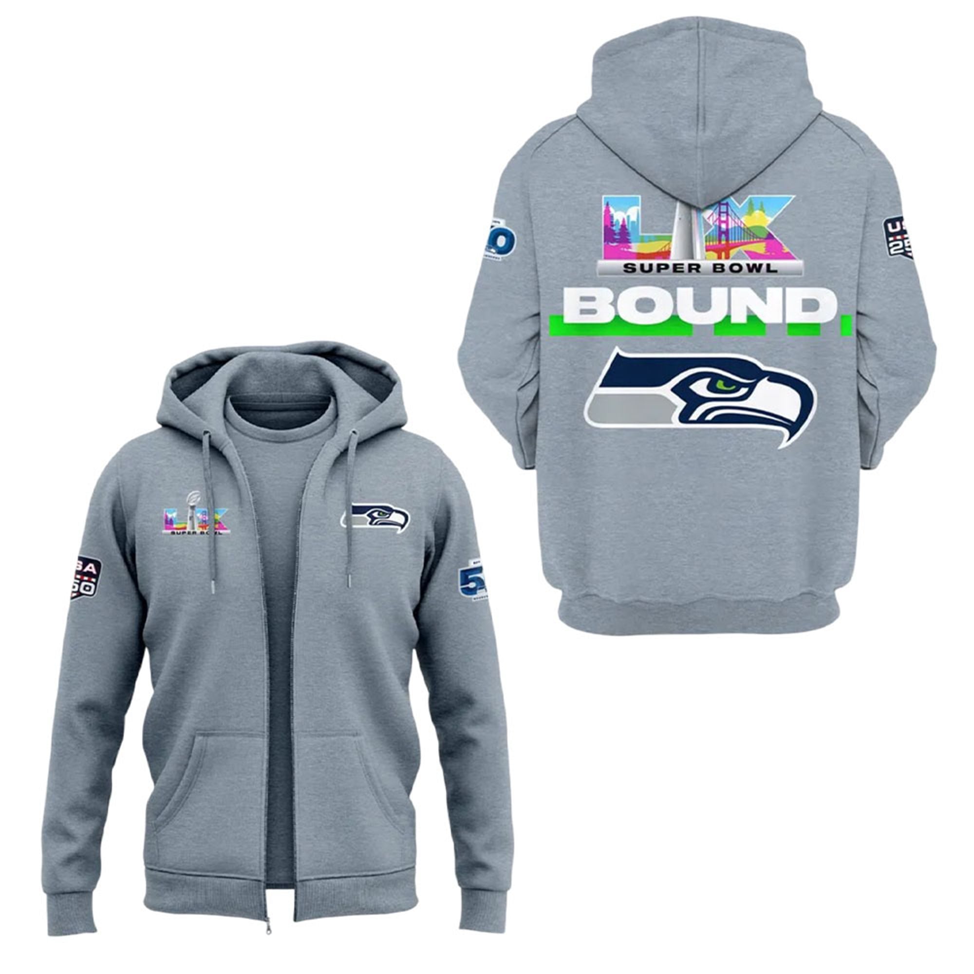 The hoodie serves as the definitive collectible for the most dedicated fans in the football. Designed to celebrate the team’s 50th anniversary, the graphics meticulously blend nostalgia with championship ambition. On the front, you’ll find the sleek Super Bowl LX branding, while the back features a bold “BOUND” graphic, signaling Seattle’s triumphant return to the world’s biggest stage. The sleeves are adorned with the 50th Season commemorative patch, a symbol of the 1,200+ players and millions of fans who have shaped this legacy since 1976.