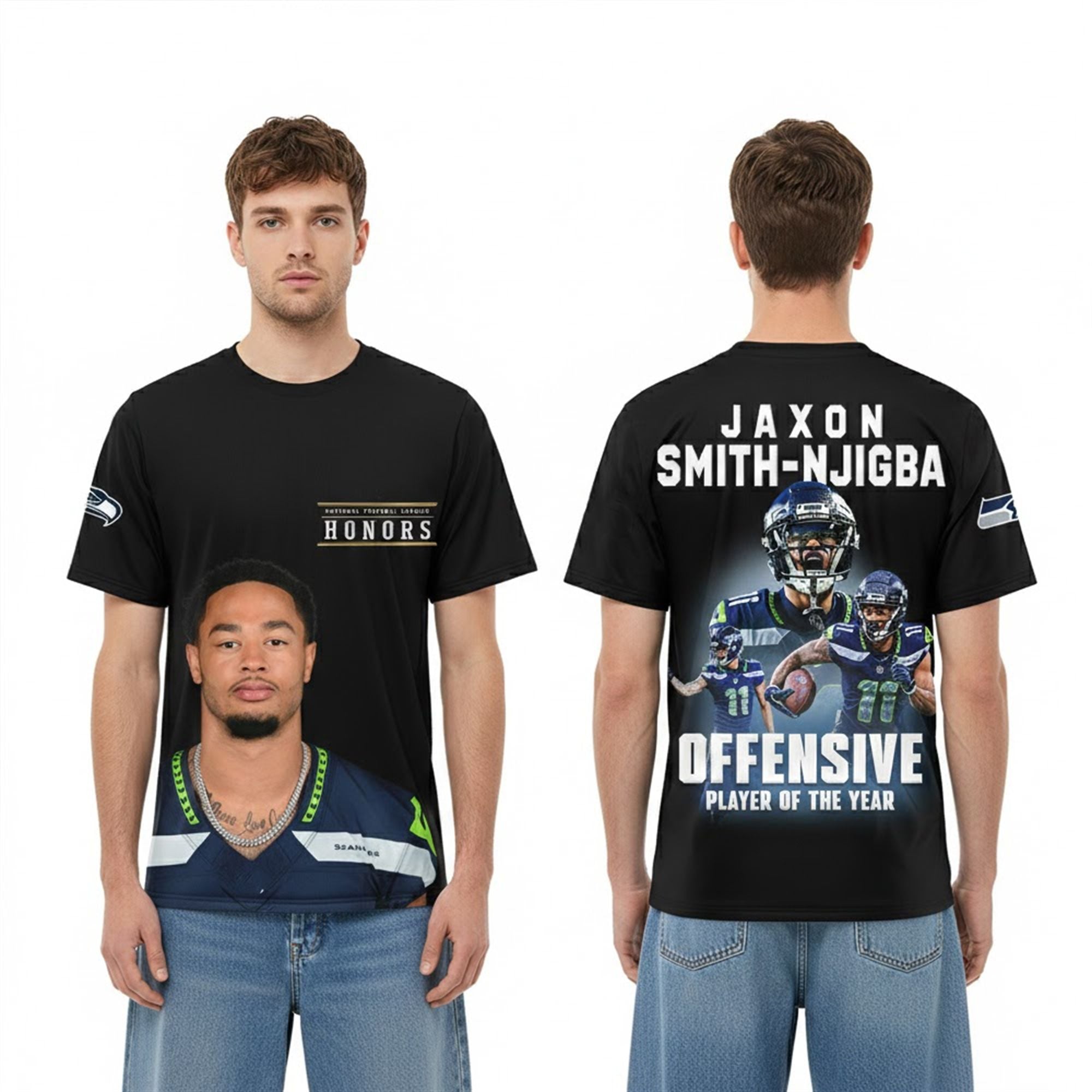 On the reverse, the design explodes with energy, featuring a dynamic collage of JSN in action. Bold, varsity-style lettering spells out “JAXON SMITH-NJIGBA” and “OFFENSIVE PLAYER OF THE YEAR,” framing multiple action shots that capture his signature moves—the impossible sideline toe-taps and the breakaway speed that led the league. The sleeve is finished with the Seahawks logo, authenticating your fandom.