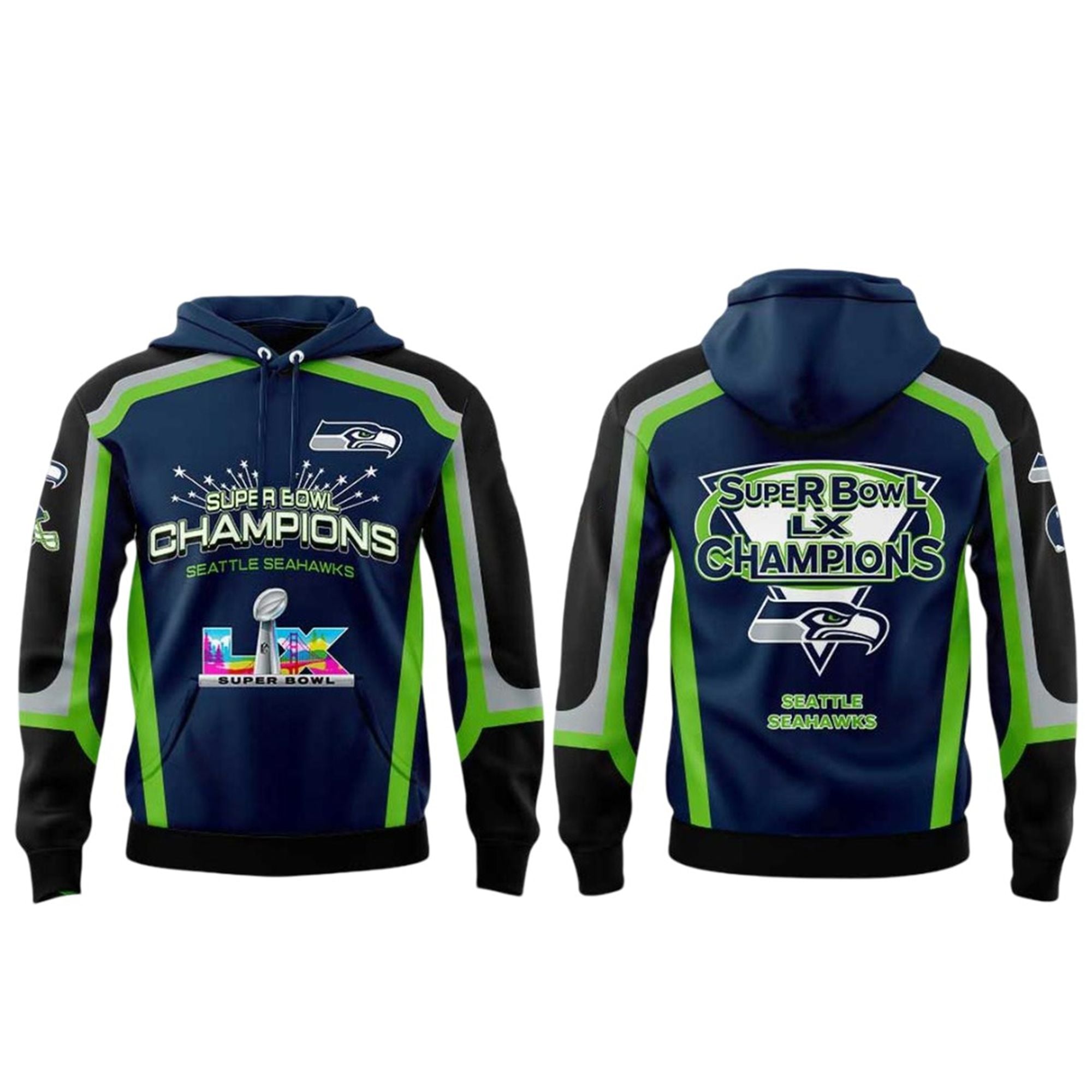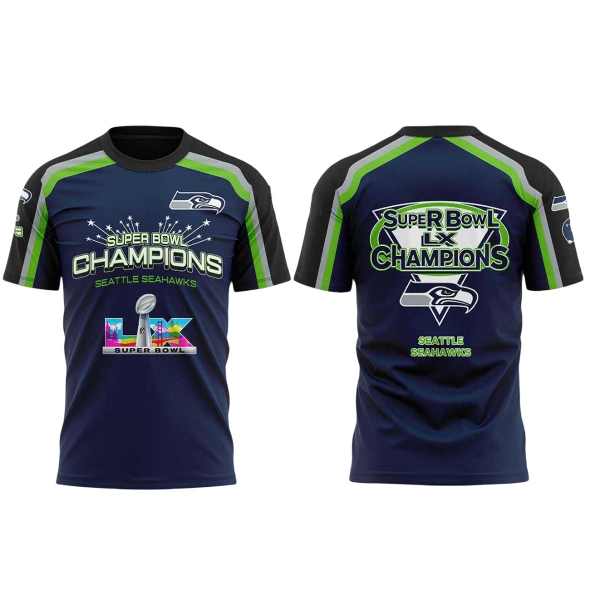 This specific design exploded across social media minutes after the final whistle because it represents the ultimate “exorcism” of the Seahawks’ past Super Bowl heartbreak against the Patriots. When the starting quarterback donned this shirt during the post-game interview and pointed to the “LX” logo, it became an instant meme symbolizing redemption. The image of the team lifting the Lombardi Trophy while wearing this navy and neon gear instantly trended globally, making it the must-have item of 2026.