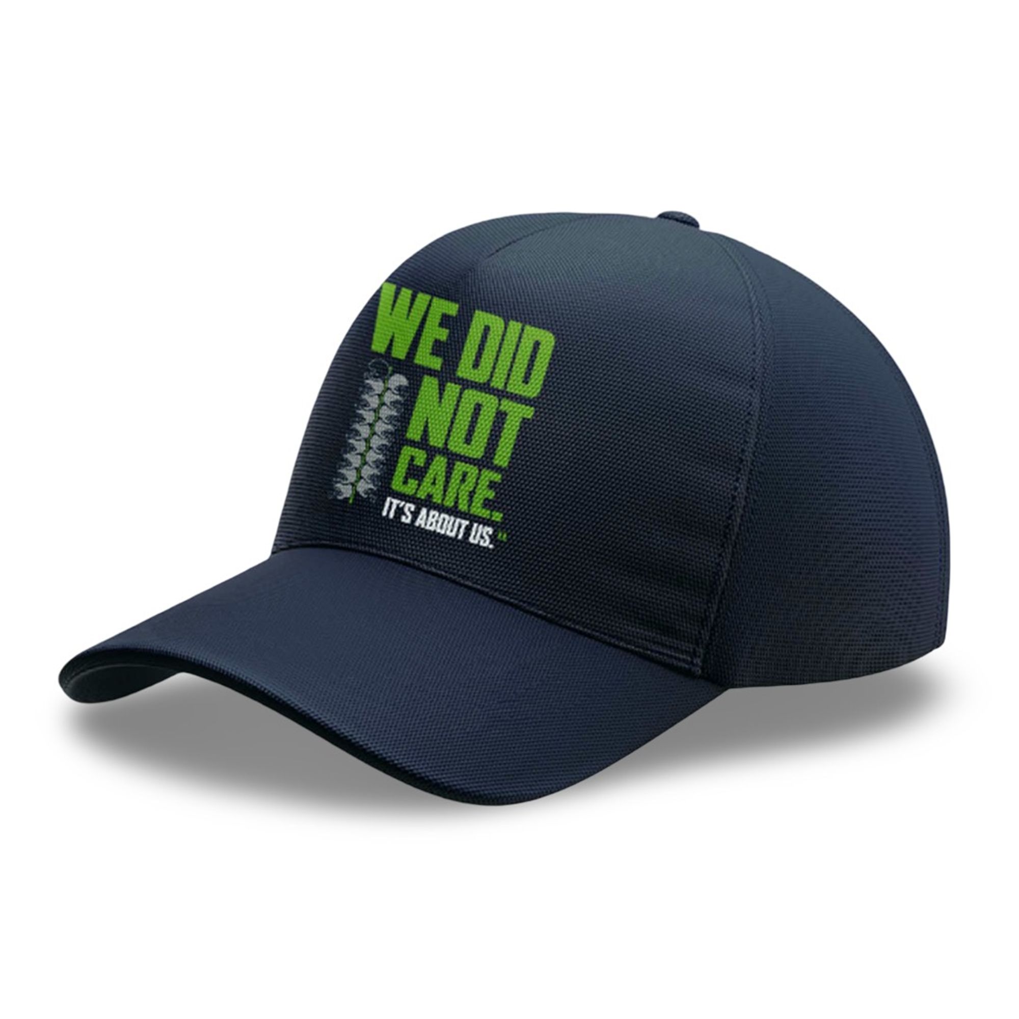 The front of the shirt commands attention with the massive, block-letter slogan: “WE DID NOT CARE. IT’S ABOUT US.” This quote, born from the heat of the locker room, signifies a team that blocked out the media noise to focus solely on their brotherhood. The text is flanked by a stylized football lacing graphic, integrating the sport’s grit directly into the typography.