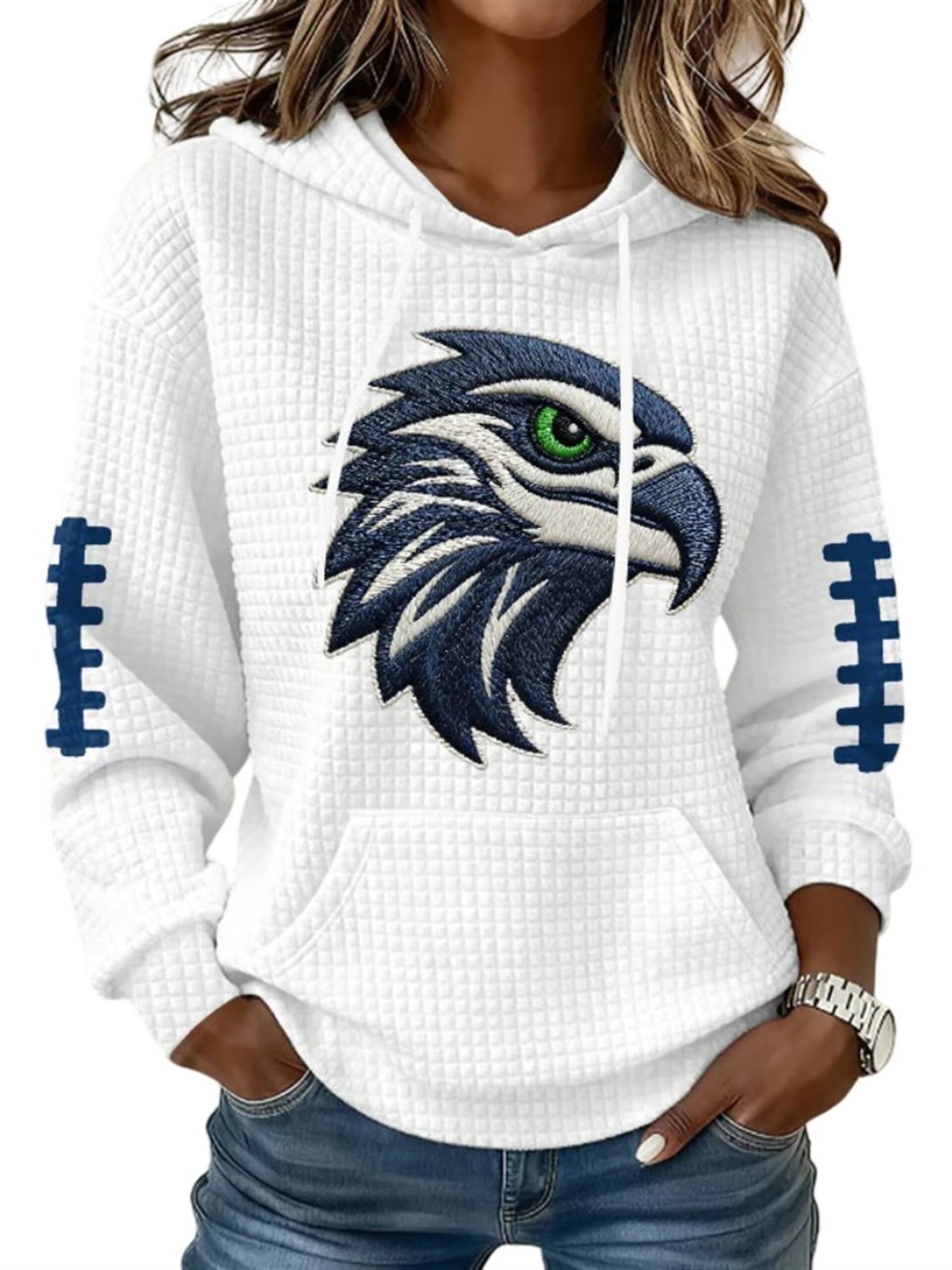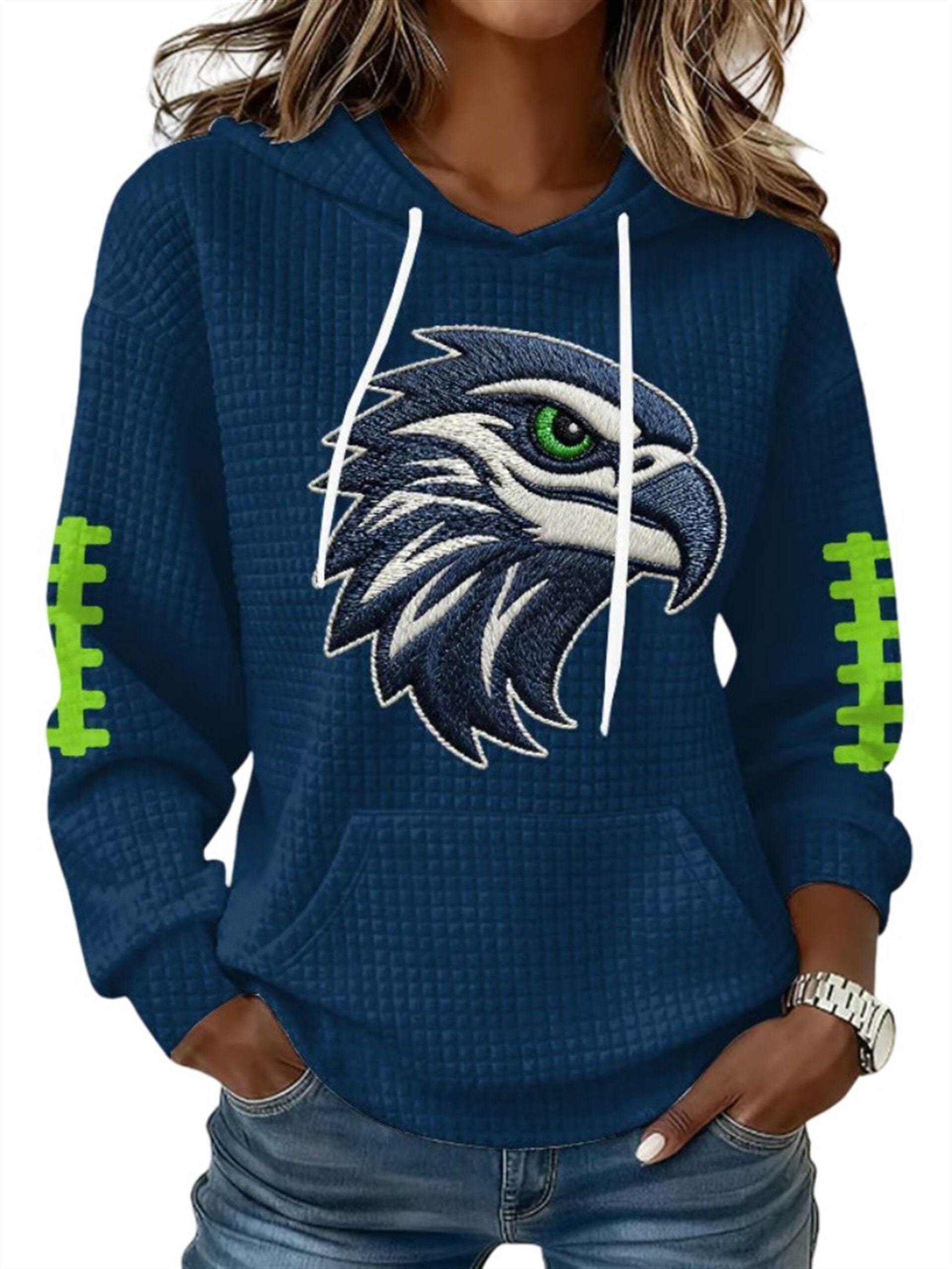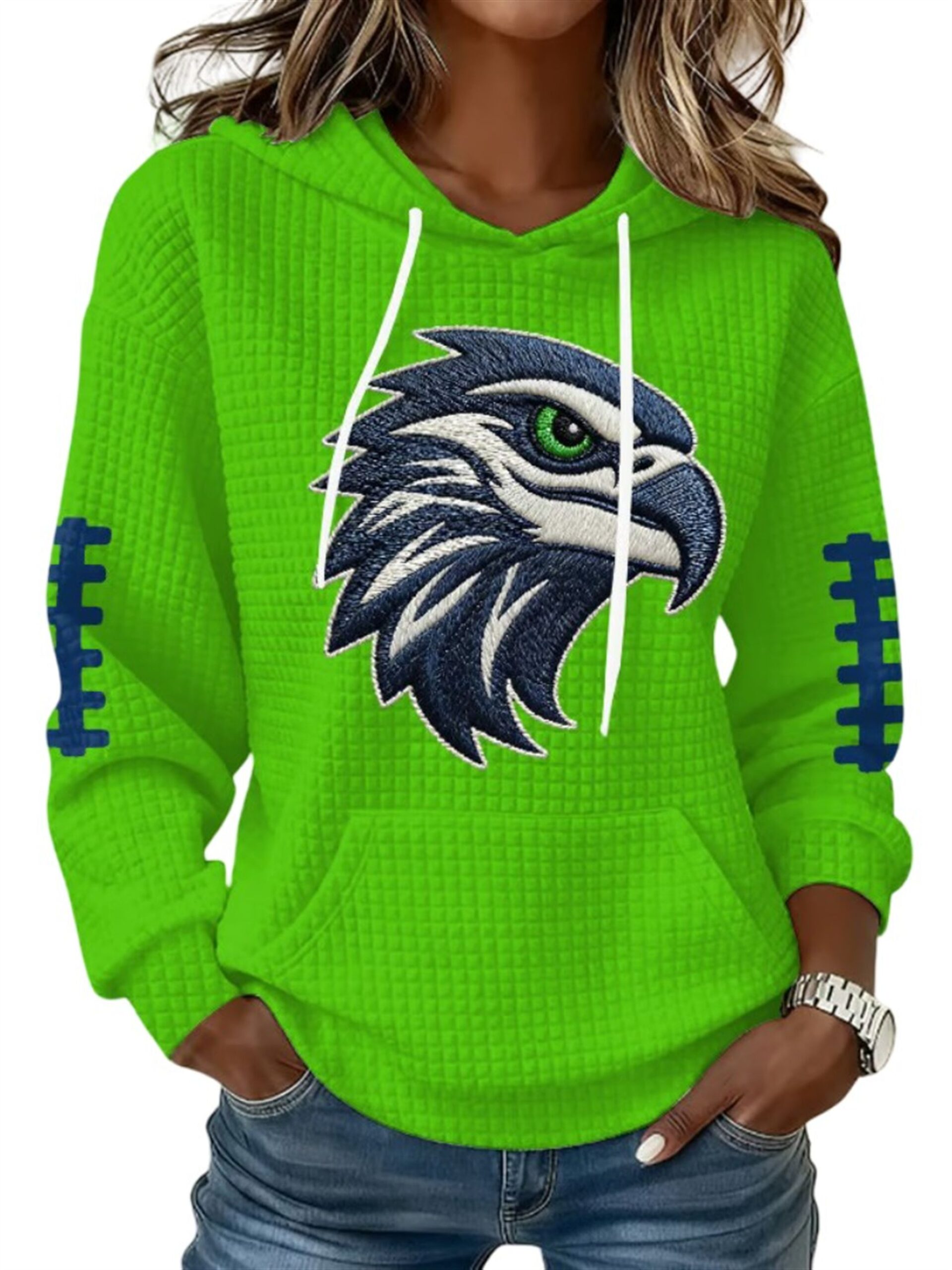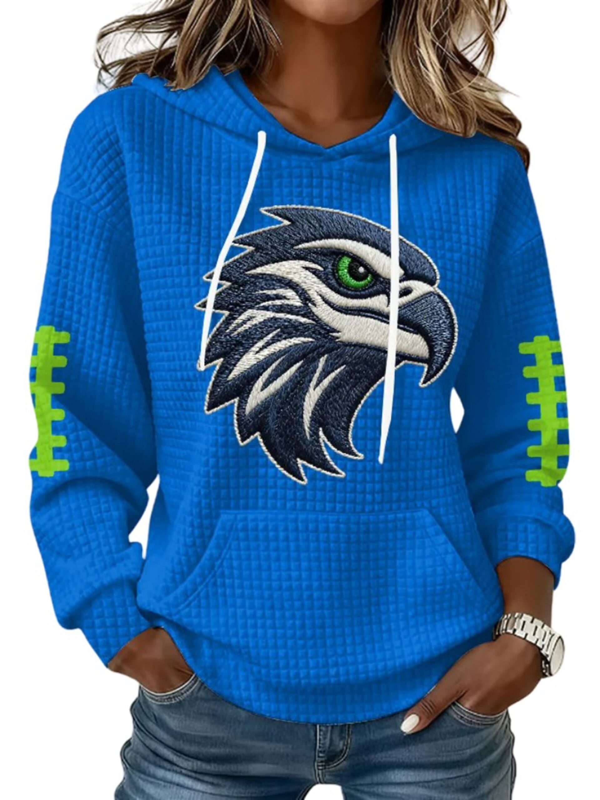 The hoodie is a masterclass in contemporary sports aesthetics. Moving away from the heavy, boxy sweatshirts of the past, this piece features a streamlined, feminine silhouette that flatters while maintaining the “oversized” comfort currently dominating global runways. The centerpiece is a high-definition, multi-textured Seahawks hawk print on the chest, flanked by unique football-stitch graphics on the sleeves that pay homage to the game’s heritage.