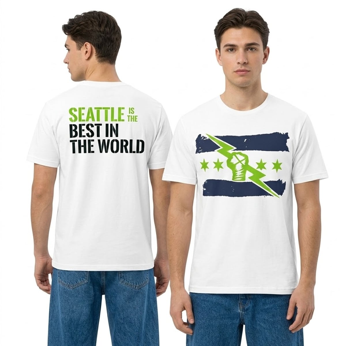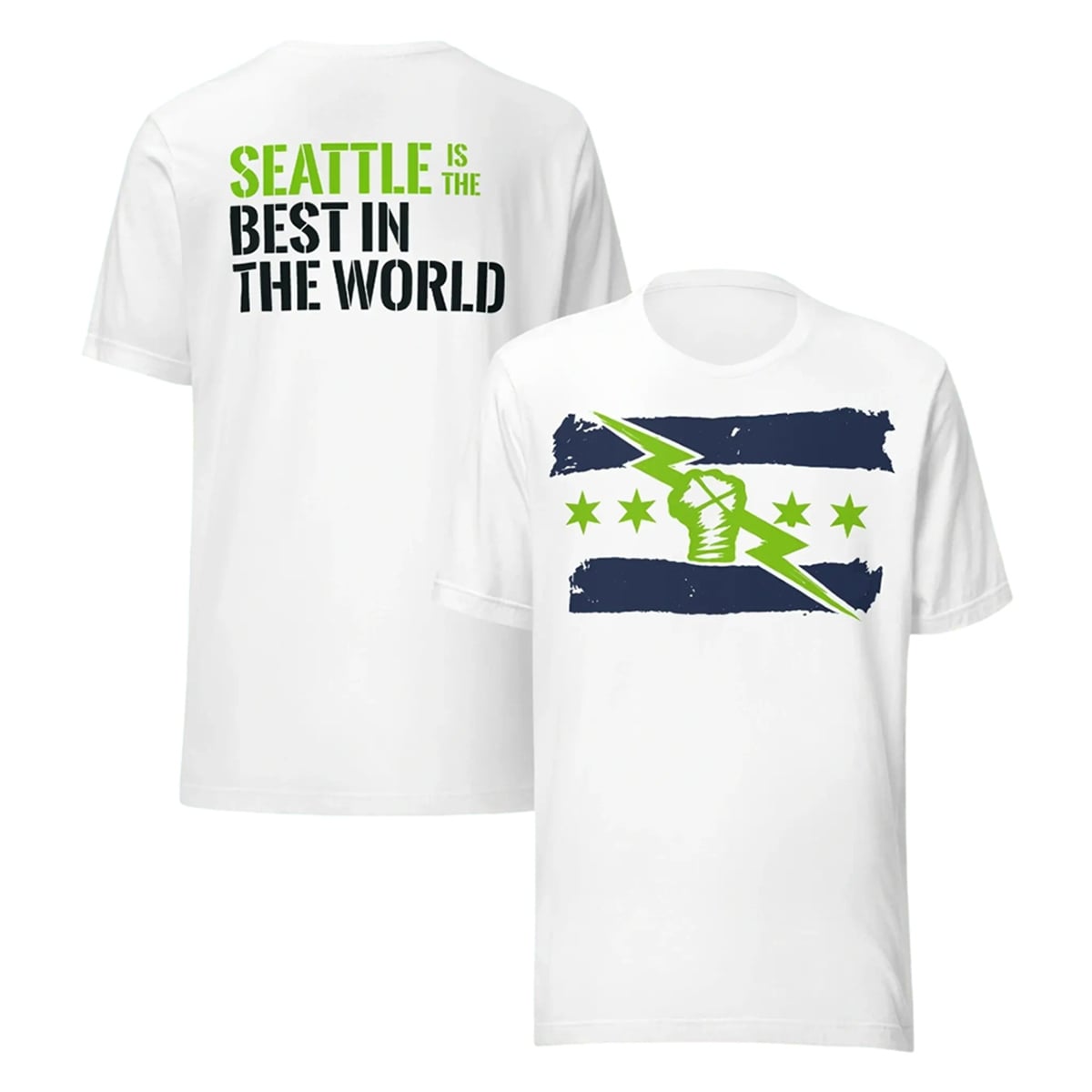The back of the item is equally striking, featuring the phrase “SEATTLE IS THE BEST IN THE WORLD” in a heavy, stencil-inspired typography. The word “SEATTLE” leaps out in a vibrant neon green, while the rest of the text anchors the design in a deep, commanding navy blue. The artistic choice to use distressed, urban-style elements gives the entire aesthetic an edgy, modern vibe that resonates perfectly with today’s streetwear and sports merch trends. It is a visual powerhouse designed purely for visual impact and fan representation.