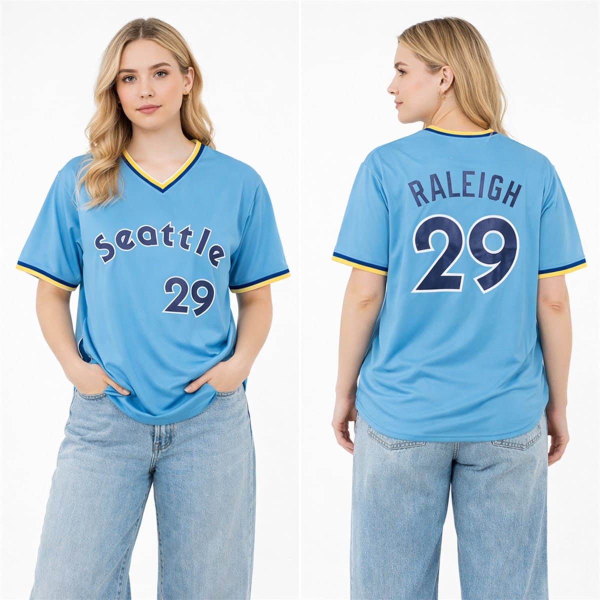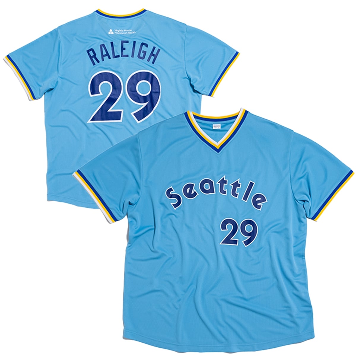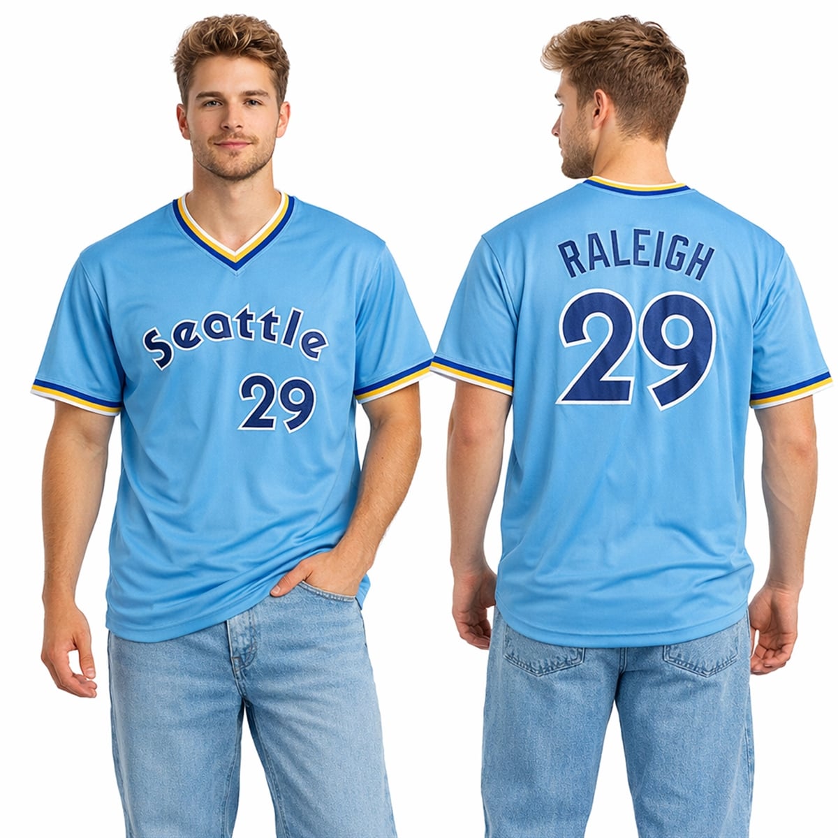 The jersey is a vibrant homage to classic baseball design. It features a stunning powder blue base, visually offset by striking v-neck collar striping in white, yellow, and navy blue. The front proudly displays the classic “Seattle” wordmark arched across the chest in retro, rounded lettering, perfectly complementing the #29. The back showcases “RALEIGH” alongside his iconic number, executing a flawless throwback aesthetic. Every visual element has been engineered to replicate the bold, colorful television broadcasts of the 1970s, making it a standout item in any setting.