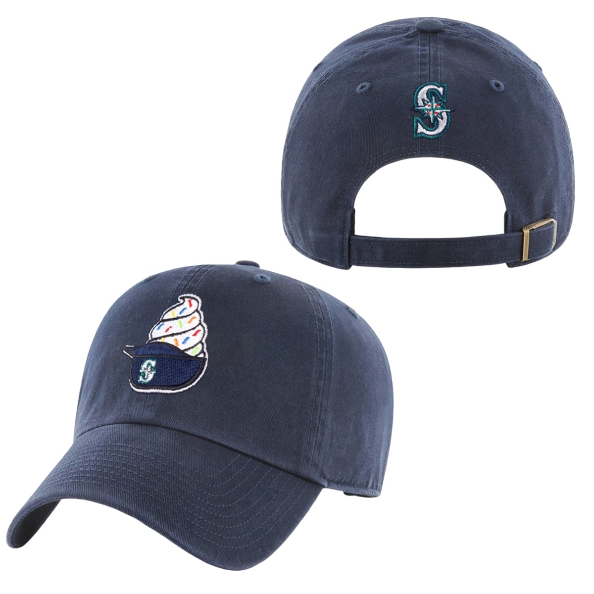 The hat redefines what it means to wear your team’s colors. Set against a classic, deep navy background, the front crown features a meticulously detailed embroidery of a beloved stadium staple: a swirl of white soft-serve ice cream, complete with vibrant, multi-colored sprinkles, nestled perfectly inside a miniature Mariners batting helmet. The iconic Mariners compass logo rests proudly on the side of the tiny helmet.