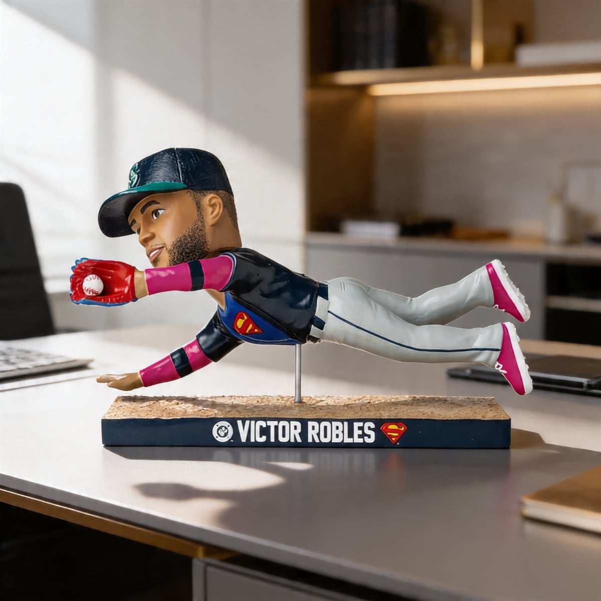This bobblehead celebrates the Seattle Mariners’ special DC Comics Night, forever immortalizing Victor Robles in a gravity-defying, mid-air diving catch. Suspended dynamically by a subtle metal support rod, the figure creates the impressive illusion of flight. Robles is decked out in a specialized Mariners uniform featuring a prominent Superman “S” shield across the chest, complemented by vibrant, eye-catching pink sleeves and matching pink cleats that pop against the traditional navy blue. The base firmly anchors the piece with the “DC VICTOR ROBLES” text alongside the iconic Superman logo and Mariners branding. Every visual element has been thoughtfully designed to celebrate both the speed of the outfielder and the legacy of the comic book legend.