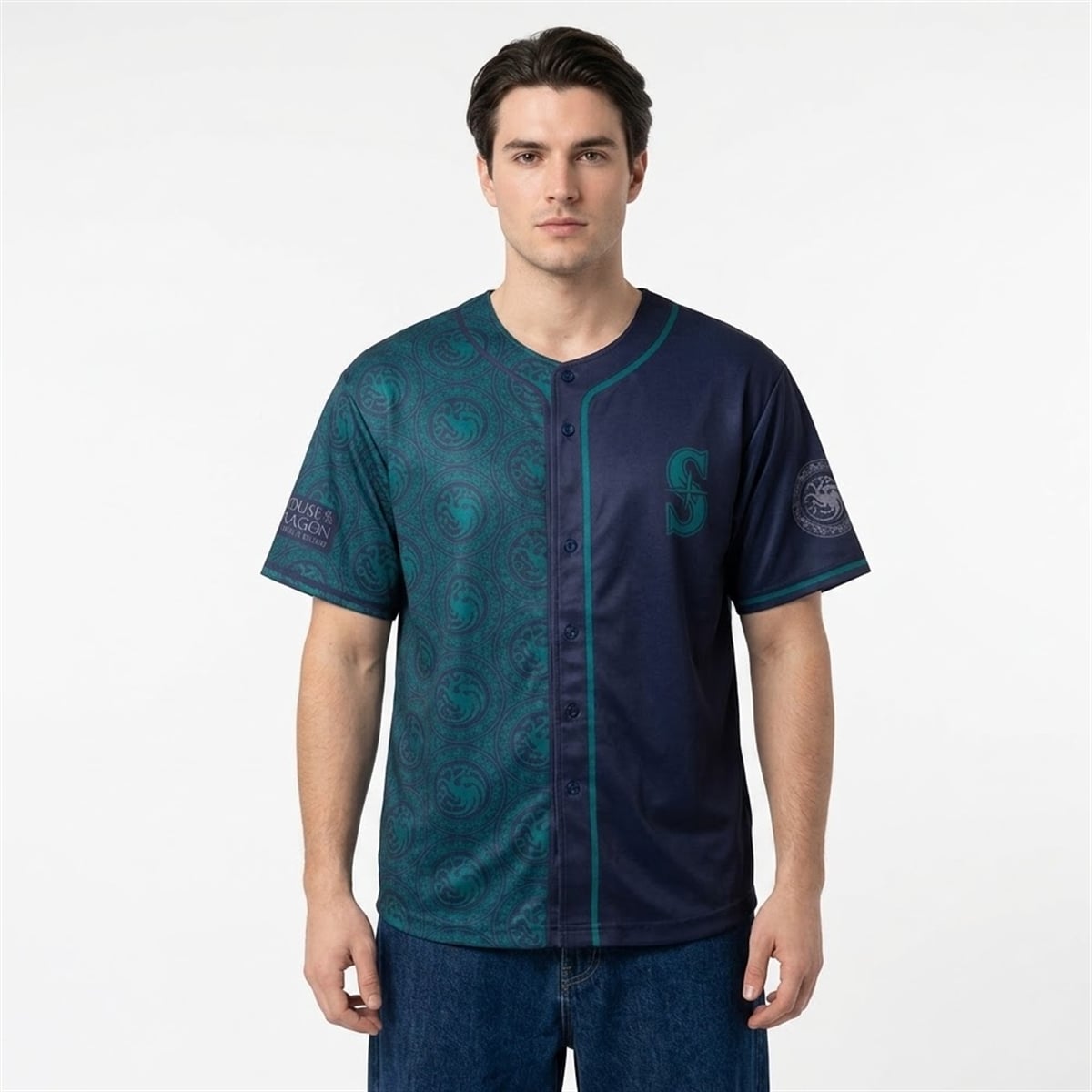 The right side of the jersey is anchored in the Mariners‘ classic, deep navy blue, proudly displaying the iconic teal “S” compass logo on the chest. Conversely, the left side is engulfed in a mesmerizing, tonal teal pattern made up of repeating three-headed dragon sigils, representing the formidable House Targaryen. The sleeves further enhance the crossover theme; one sleeve bears the “House of the Dragon” title card logo, while the opposite sleeve features a crisp, silver-toned Targaryen crest. It is a button-up style that seamlessly integrates stadium readiness with cinematic fantasy.